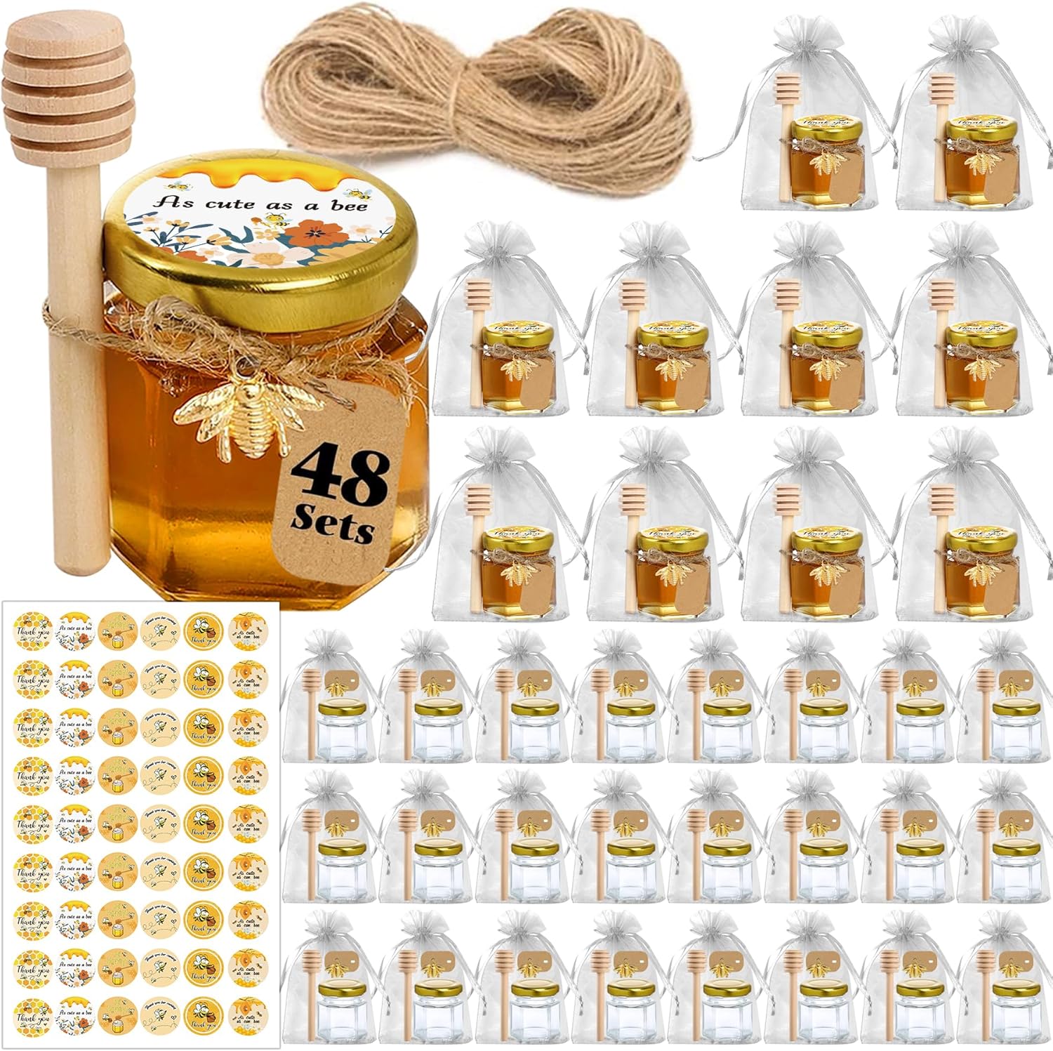 - Great Value Mini Honey Jars Set: This set includes 48 hexagon mini honey jars with dippers, lids, stickers, bee charms, gift bags, tags, and 25m of jute twine. Everything you need to craft thoughtful party favors or sweet handmade gifts with ease.
