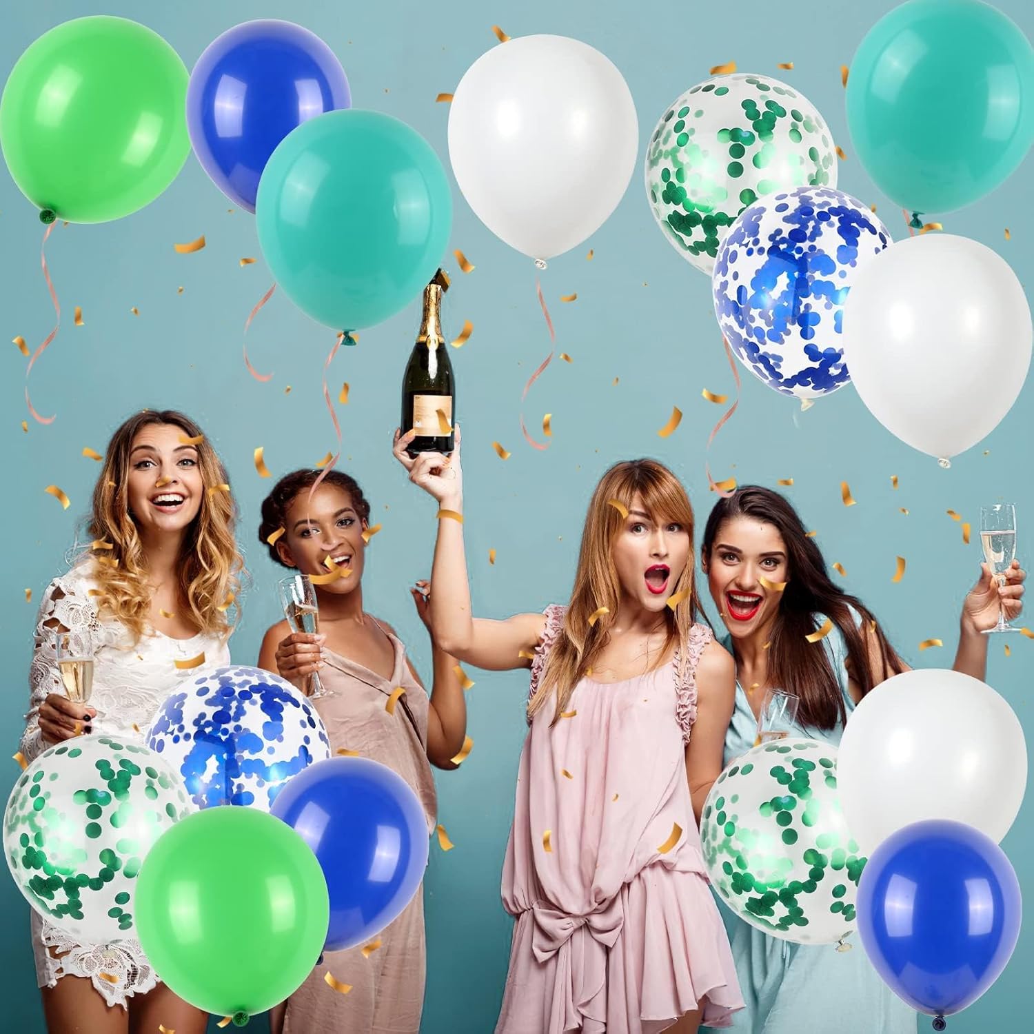 - 50 PCS LATEX BALLOONS: The set includes 11 green, 4 green confetti, 4 blue confetti, 10 teal blue, 10 white, 11 blue balloons, plus 1 ribbon. Adds extra fun to any party.