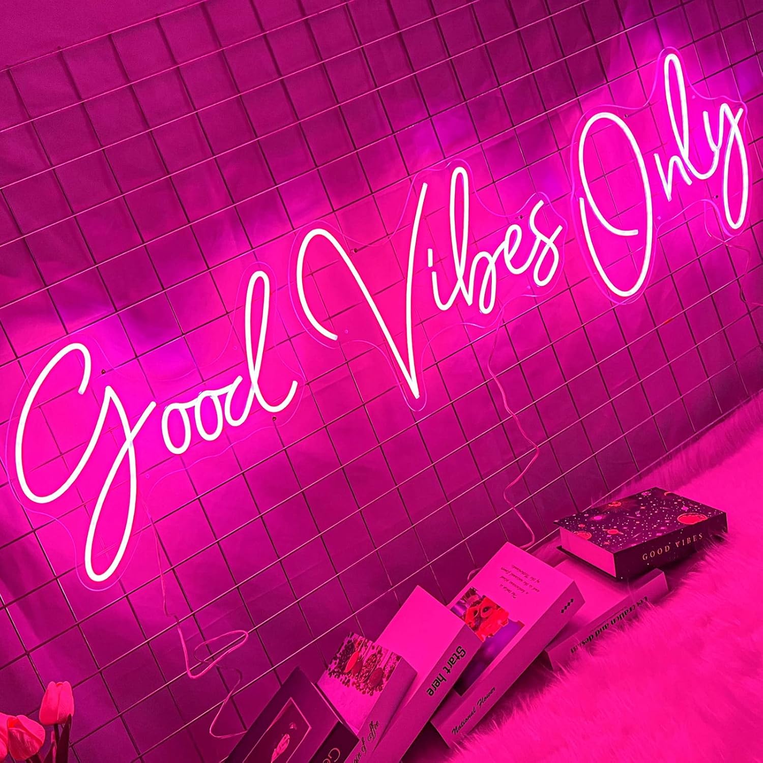 - 【Easy to Use】Good Vibes Only neon sign, size: 56.57x13.54in, neon sign includes adapter, power cord, dimmer switch, chain, hanging ring, nail, LED neon signs is light weight, with small holes on the back panel, it can be easily installed, You can quickly hang or fasten it to a wall, or place it anywhere flat.