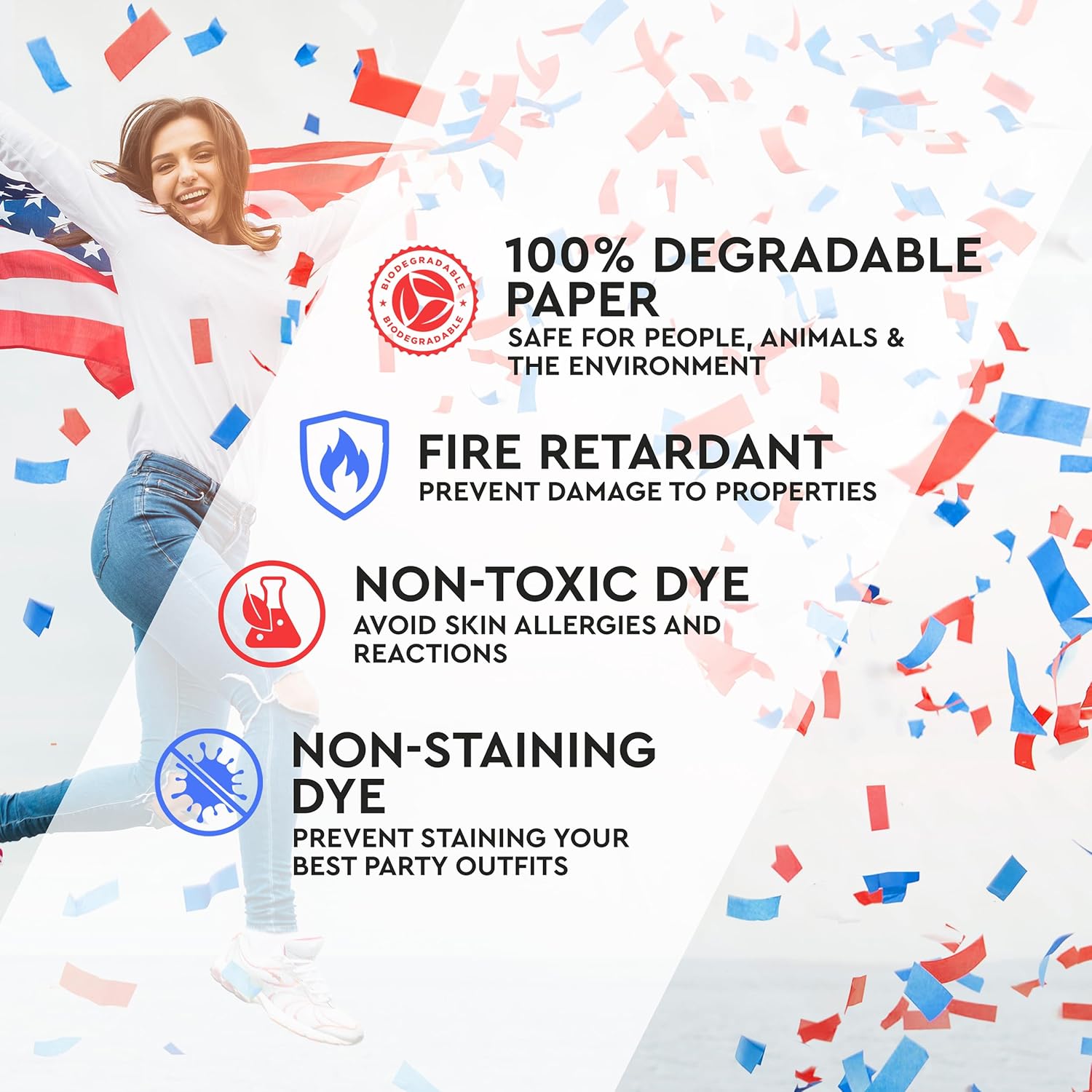 - ๐ RED WHITE & BLUE CONFETTI - 100% BIODEGRADABLE - Confetti are made of lightweight fire resistant papers, 100% biodegradable. Color dye is non-toxic and won't rub onto your clothing. 100% safe for your party and good for the environment.