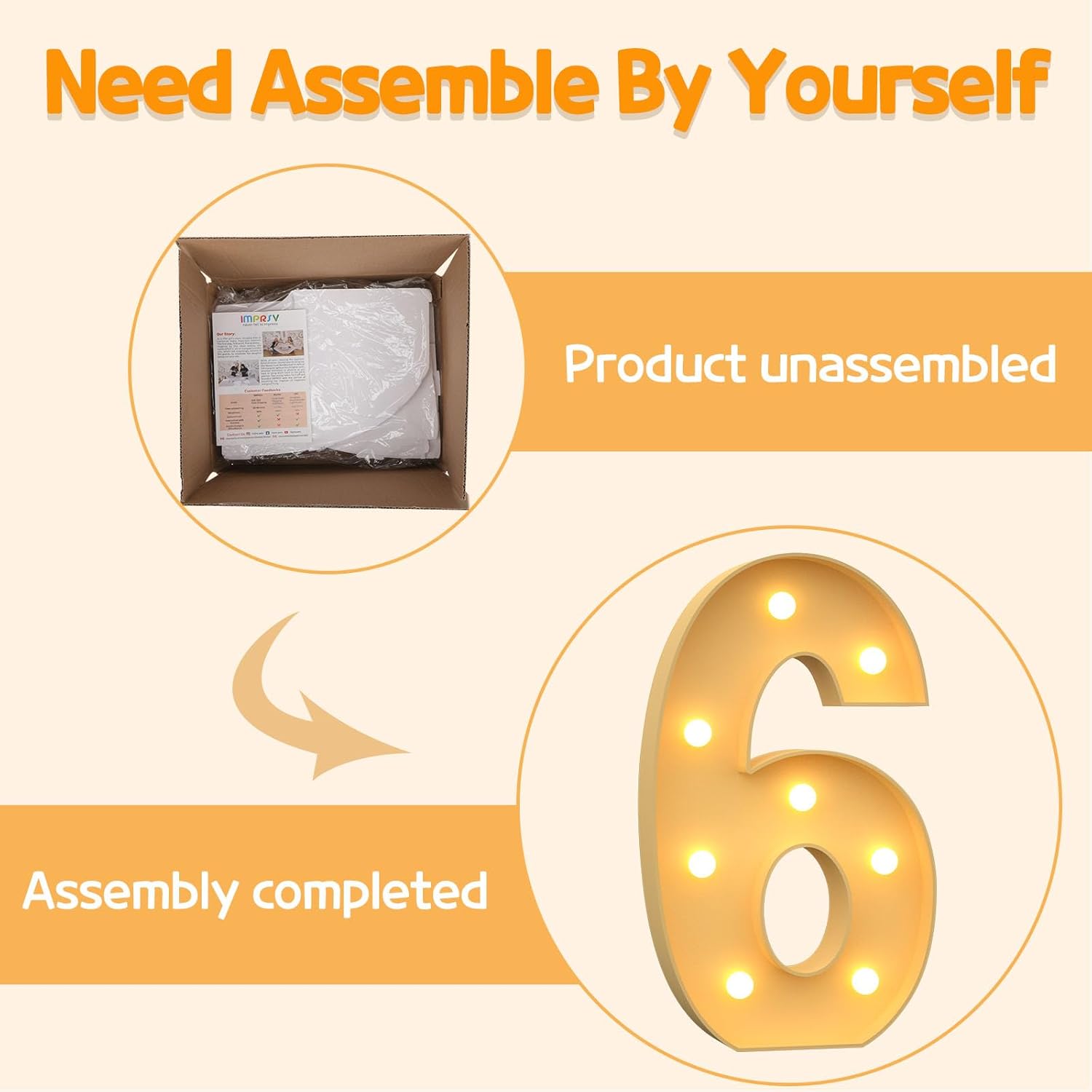 - Assembly Required: Our large marquee numbers is made from foam board and easy to assemble with our splicing mode. Just follow the numbered instructions to align and insert the bottom plate, and reinforce it with a hot glue gun. Then, you're done!