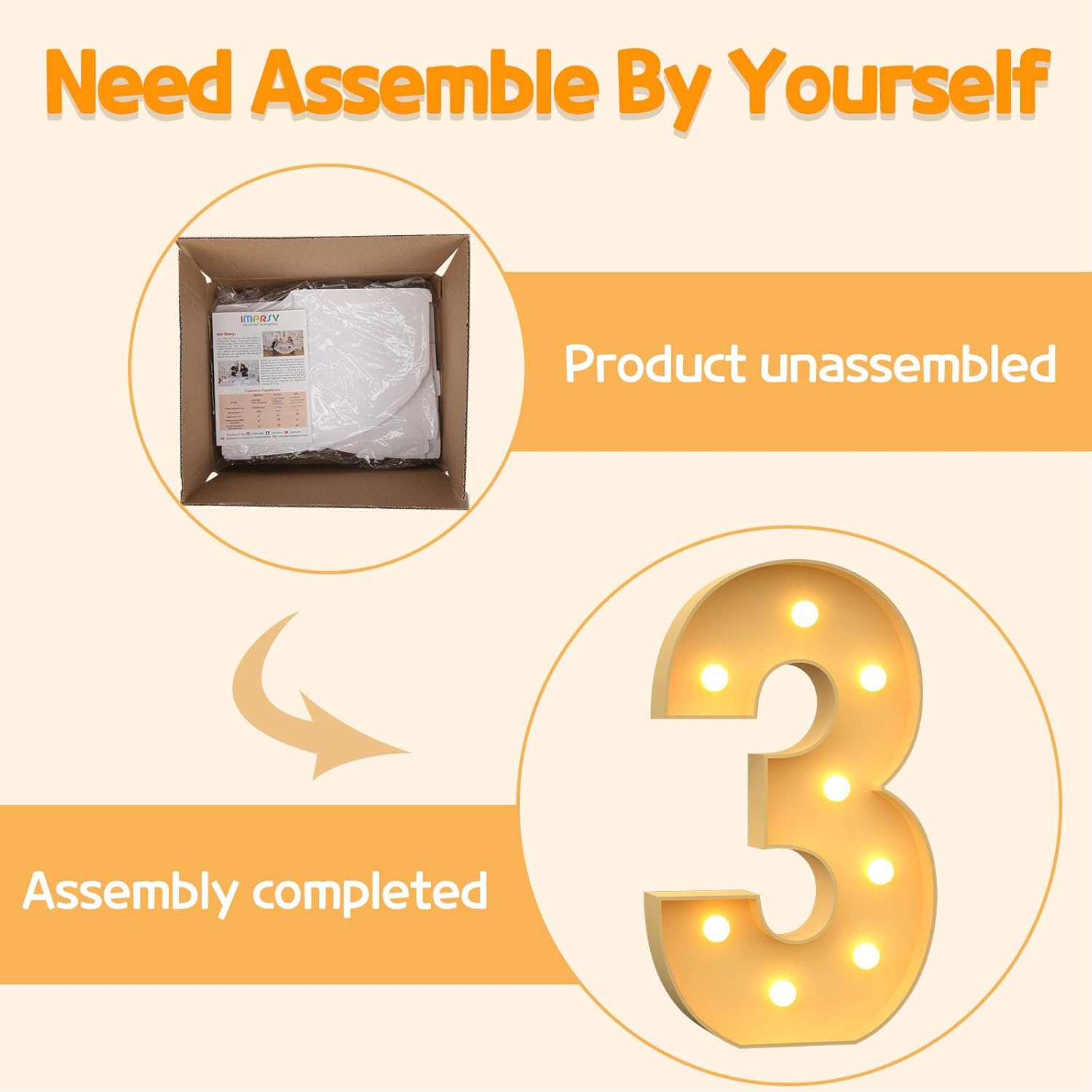 - Assembly Required: Our large marquee numbers is made from foam board and easy to assemble with our splicing mode. Just follow the numbered instructions to align and insert the bottom plate, and reinforce it with a hot glue gun. Then, you're done!