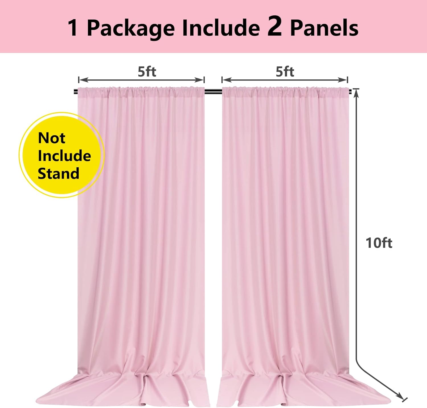- DIMENSIONS: Each curtain measures 5 feet wide x 10 feet high. Entire backdrop measures 10 feet wide x 10 feet high.Each curtain panel comes with 4 inch rod pocket on top, fit up to any standard rods. (Please note: Dropback Curtains Only,No Backdrop Stand)