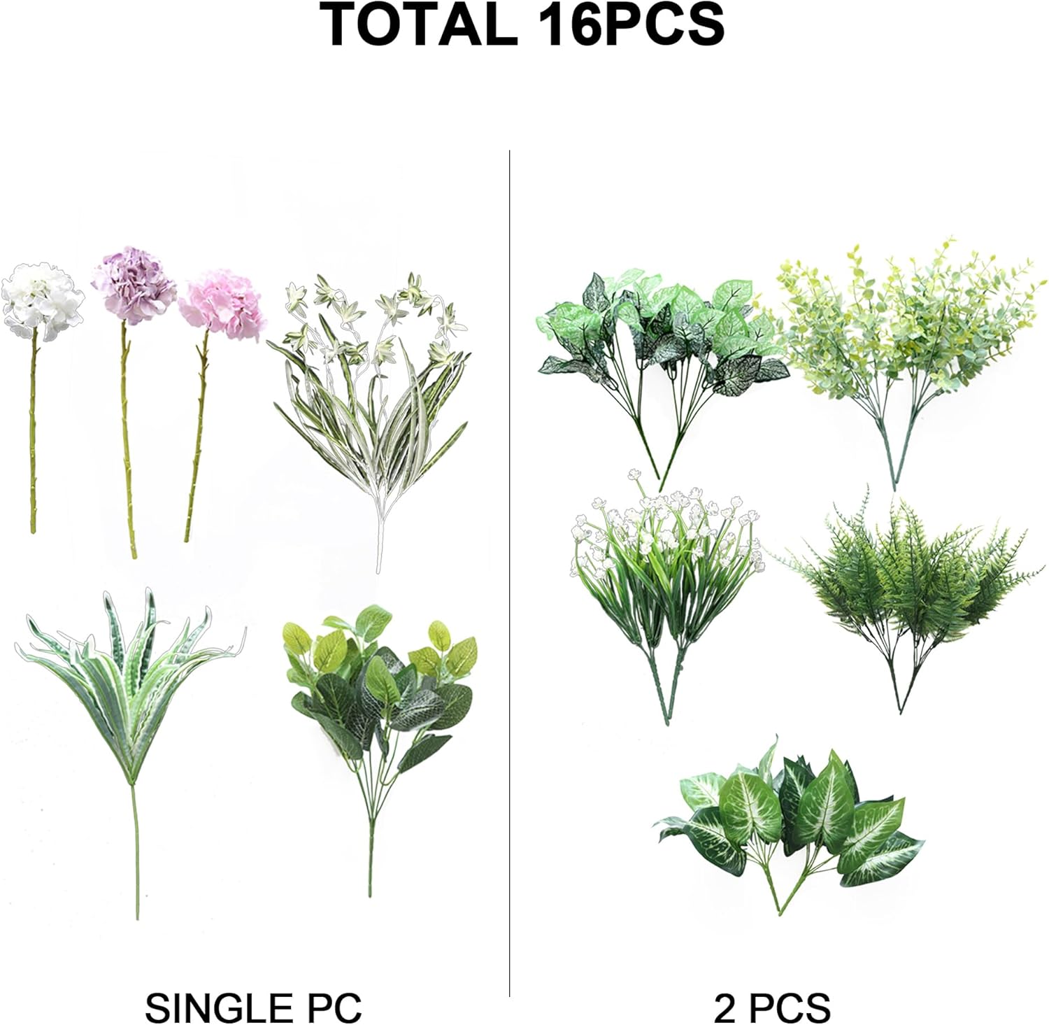 - Cost-effective Combination: Each package contains 12 different kinds of artificial greeneries and flowers, which totally has 18 pcs. Within them, you can get 3 pcs of hydrangeas in three colors and 15 pcs of eucalyptus bunches. It is so enough for you to combine or divide them any way you like to create a vibrant corner and add a fresh looking for you house.