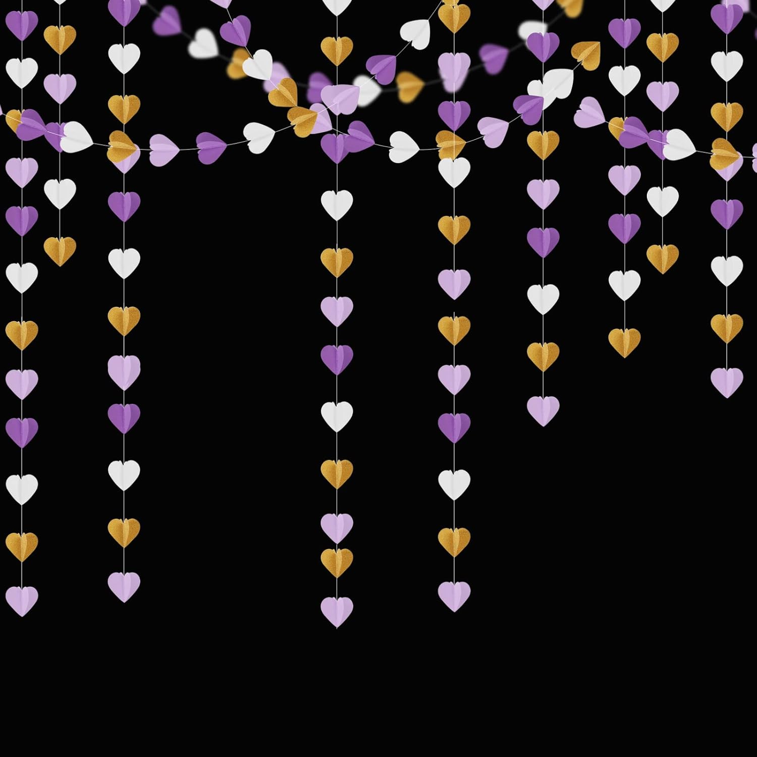 - 【Material】The heart is 2 dayers paper, please open them so they can have the 3D effect. The material is eco-friendly purple white gold paper.You can cut to any length you want if you need shorter length.The hearts are cut very neatly.