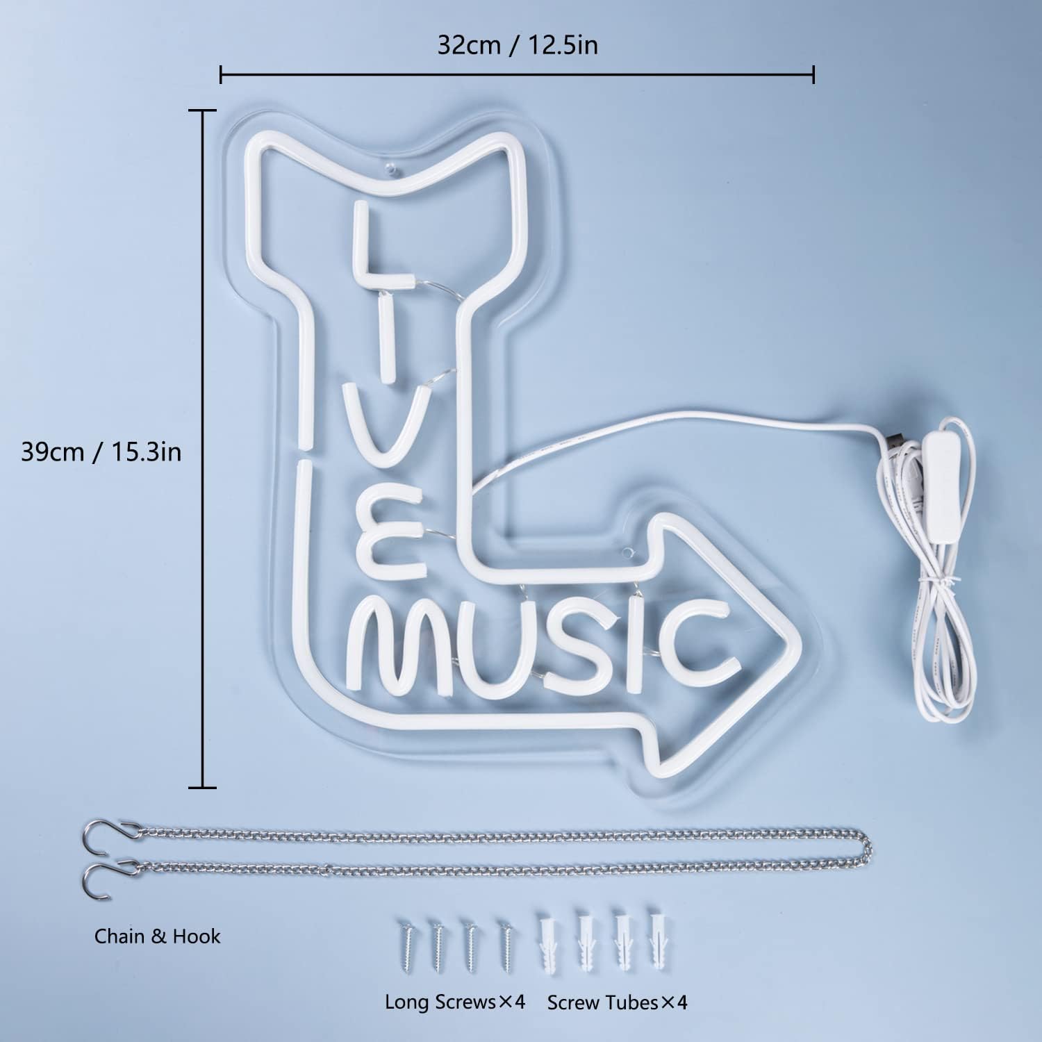 - Product Spec: 15.3" Ă— 12.5" Music LED Wall Sign uses 5V low voltage, with a controllable switch. Package include 1 neon sign, 1 wall hanging chain, 4 long screws, 4 screw tubes. A USB charger is not included, but the USB connector is plug and play.