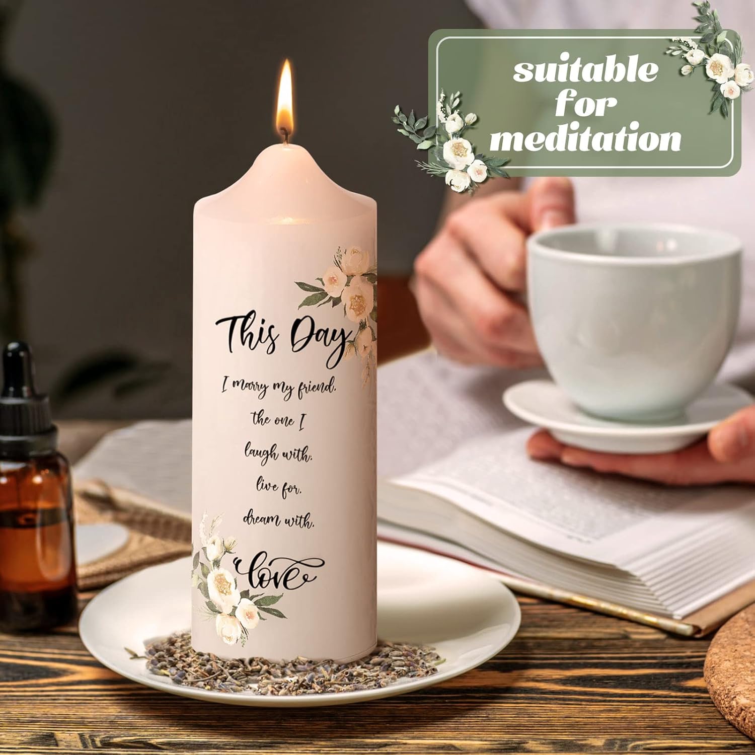 - Eucalyptus Leaf: the verse on the candle reads [this day I marry my friend, the one I laugh with, live for, dream with, love], eucalyptus leaf, and love elements; Romantic and charming