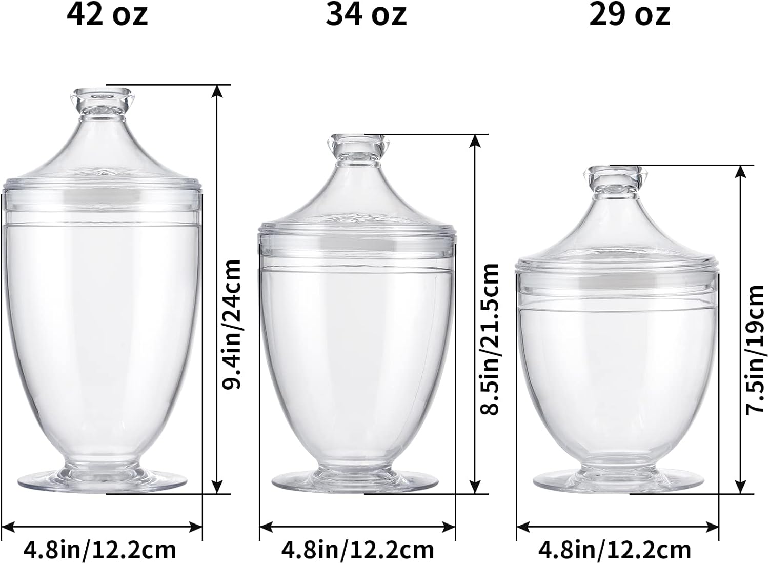 - SIZE: Package includes 3 apothecary jars in different sizes, large size 42 ounce, medium size 34 ounce, small size 29 ounce