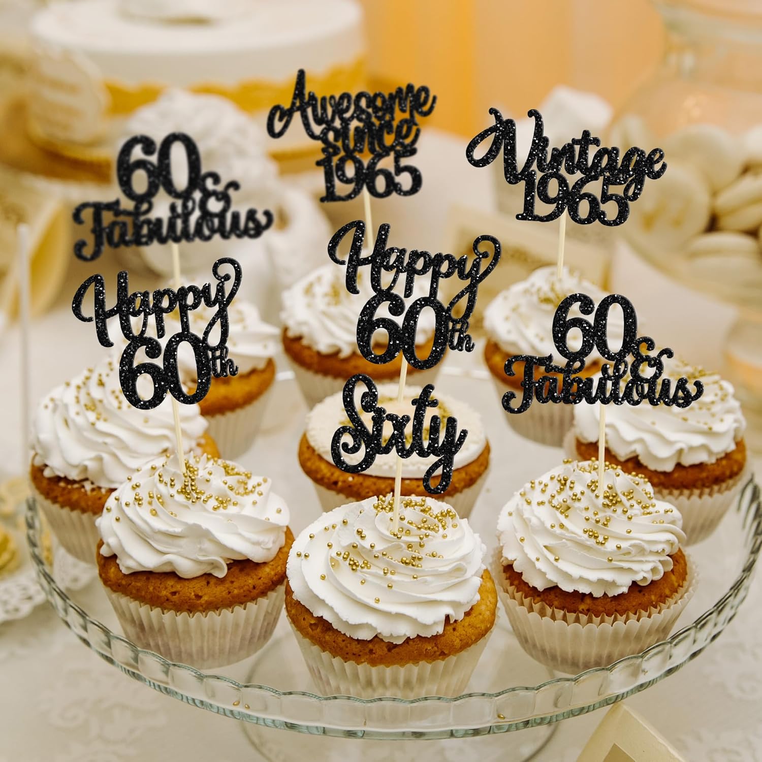 30Pcs Happy 60th Birthday Cupcake Toppers Glitter Sixty Vintage 1965 Cupcake Picks Cheers to 60 Fabulous Cake Decorations for 60th Birthday Wedding Anniversary Party Supplies Black