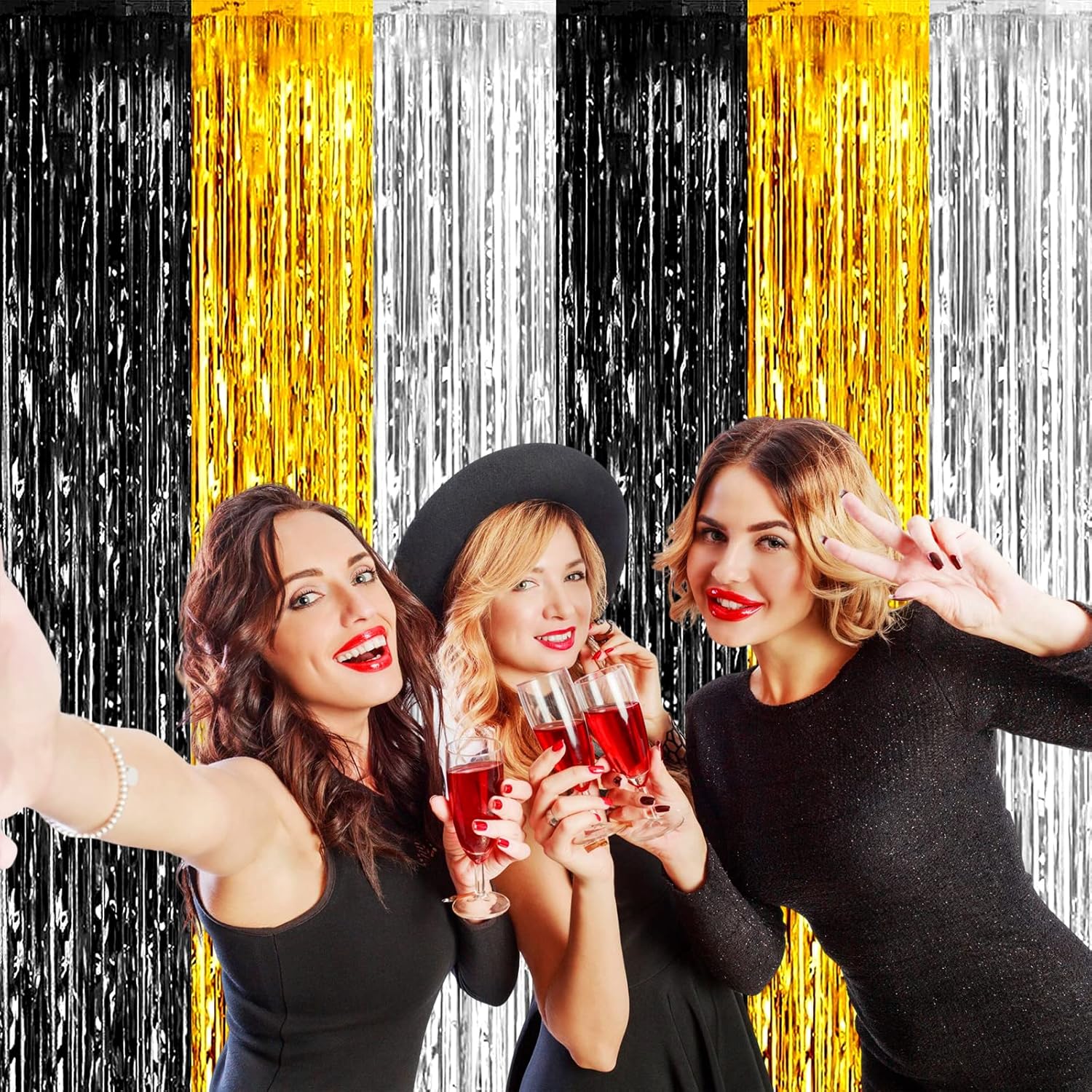 4 Pack Black Gold Silver Foil Fringe Curtain Backdrop, 3.28Ft x 8.2Ft Metallic Tinsel Foil Fringe Streamers for Photo Booth, Wedding, Notorious One Birthday Roaring 20s Graduation Party Decoration