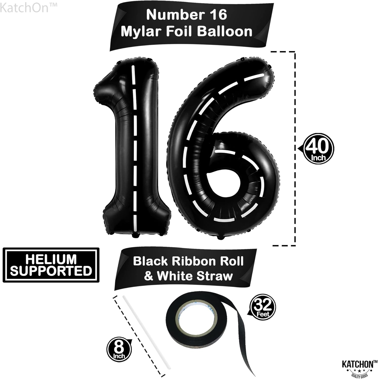 - LARGE SIZE - 40 INCH | BEAUTIFUL ROAD THEME NUMBER BALLOONS - This Black 16 Balloon number 40 inch is the party complement you shouldnât miss. Add a great impact to your decoration with this gaint sweet 16 balloons Car Mylar Foil comes with, 1 Black Ribbon and 1 Straw to Inflate balloons. Pair this sweet 16 balloons number with other balloons to create Wonderful Decor yo your birthday, New Driver Party Decorations or anniversary decorations.