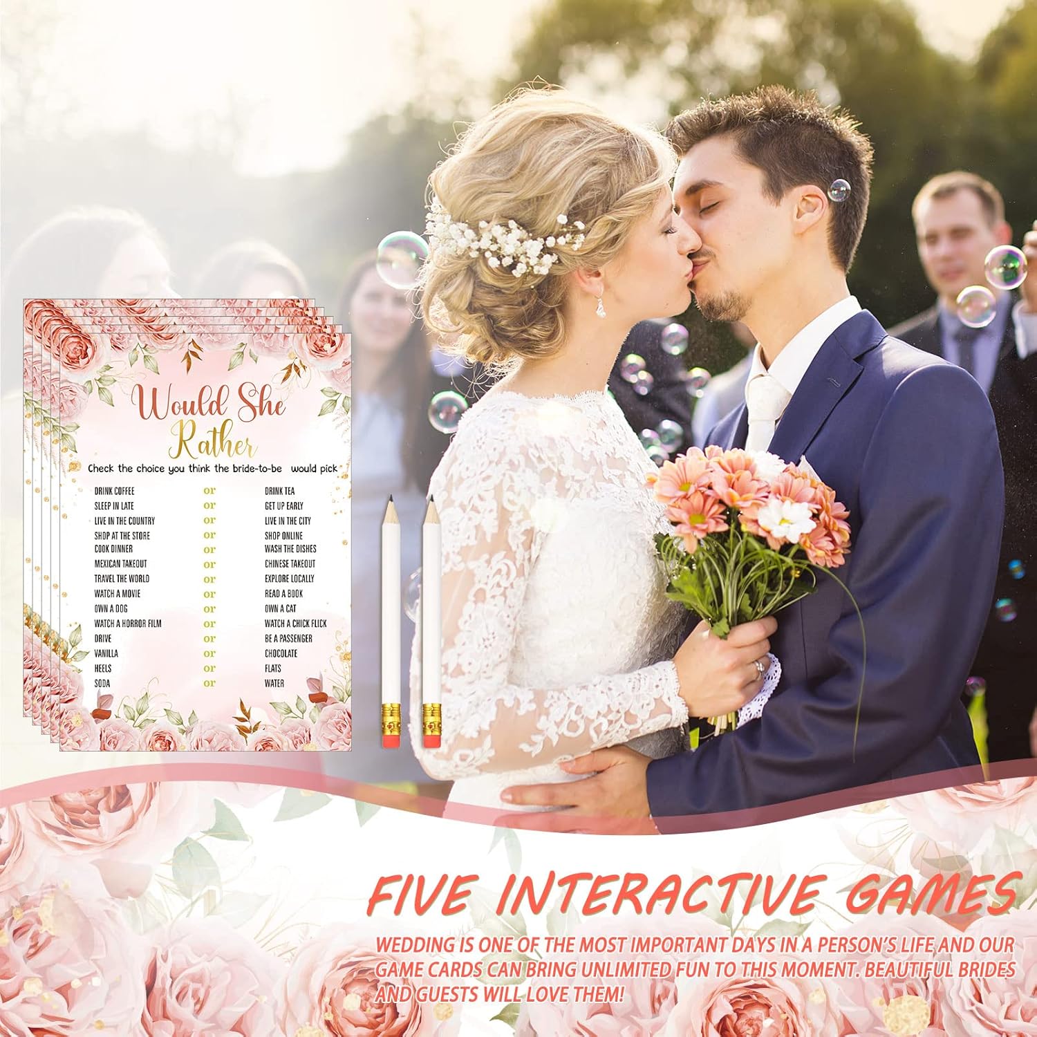 - 5 Styles of Fun Bridal Shower Games: our game bridal shower cards contain 5 fun games, including "Would She Rather", "Bride Or Groom Guess Who", "Bridal Word Scramble", "Wishes For The Bride And Groom", "What's In Your Purse"; These cards provide your guests with a fun wedding game to help them fully enjoy the party and elevate the mood