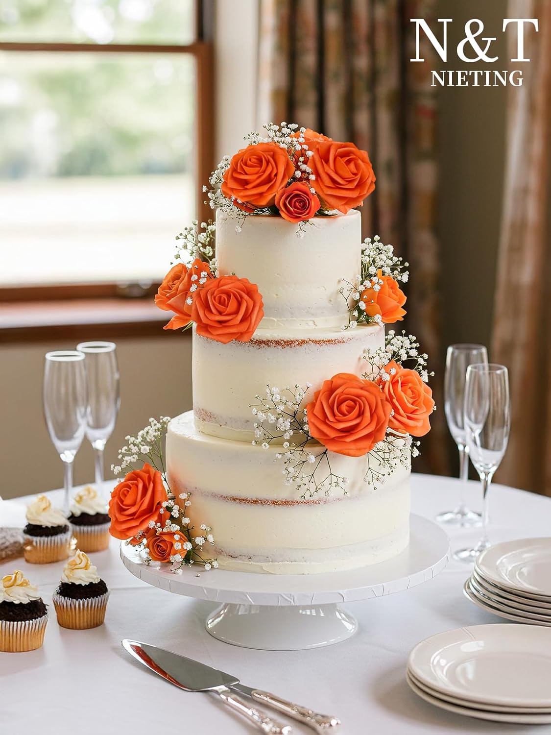 N&T NIETING Artificial Fall Flowers Fake Flowers Orange Roses Perfect for DIY Wedding Bridal Bouquets Centerpieces Bridal Shower Party Home Flower Arrangement Thanksgiving Decorations, 25Pcs