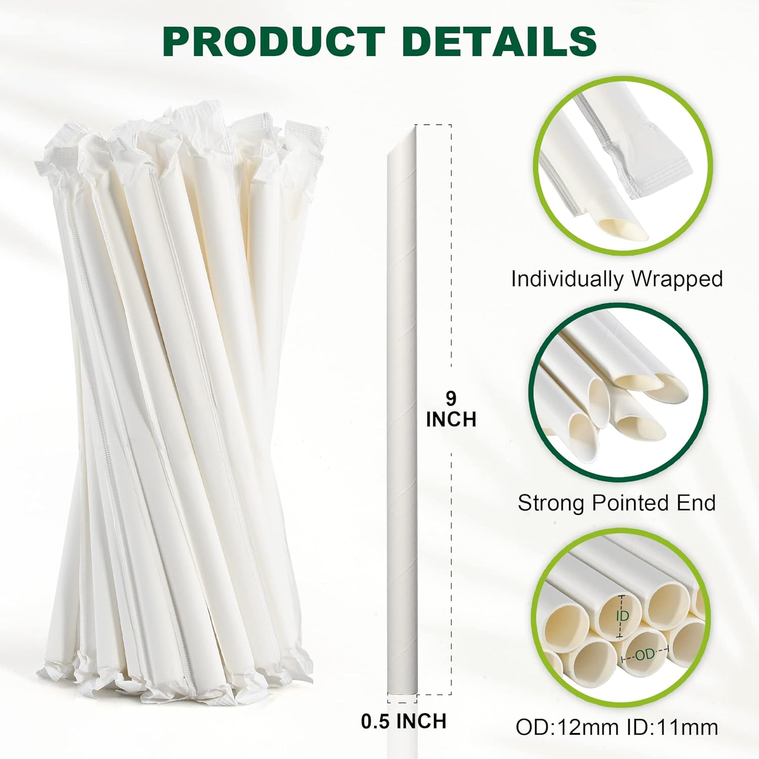 9 Inch Individually Wrapped Disposable White Paper Boba Straws, Bubble Tea Straws 100 Counts, 0.5"/12mm Wide - Pointed End, Extra Thick, Fat - Eco-friendly Biodegradable