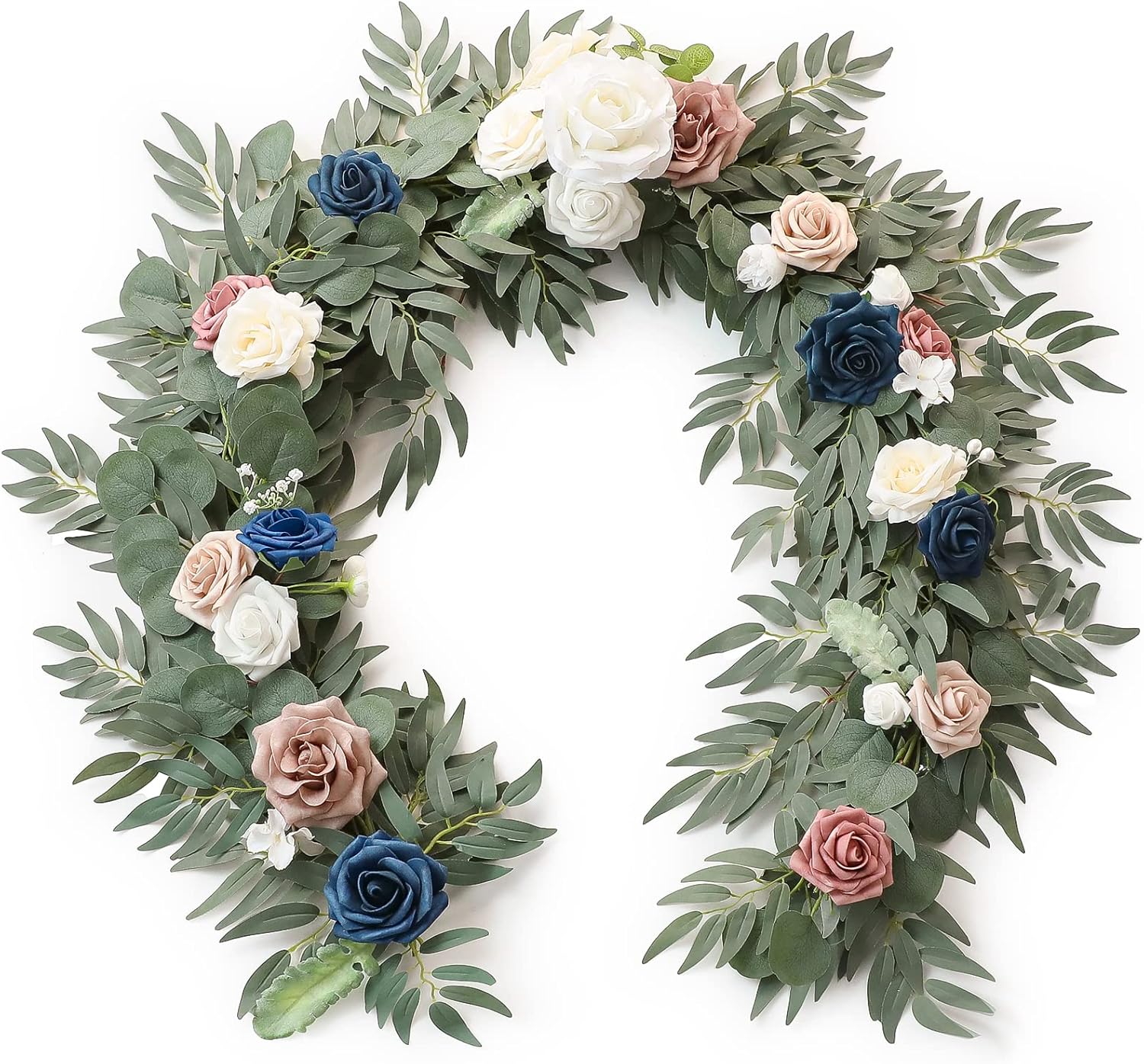 Floroom 6ft Artificial Eucalyptus Garland with Flowers Fake Greenery Faux Floral Vine Garland for Table Decor Wedding Centerpieces Bridal Shower Party Decorations, Dusty Rose & Navy
