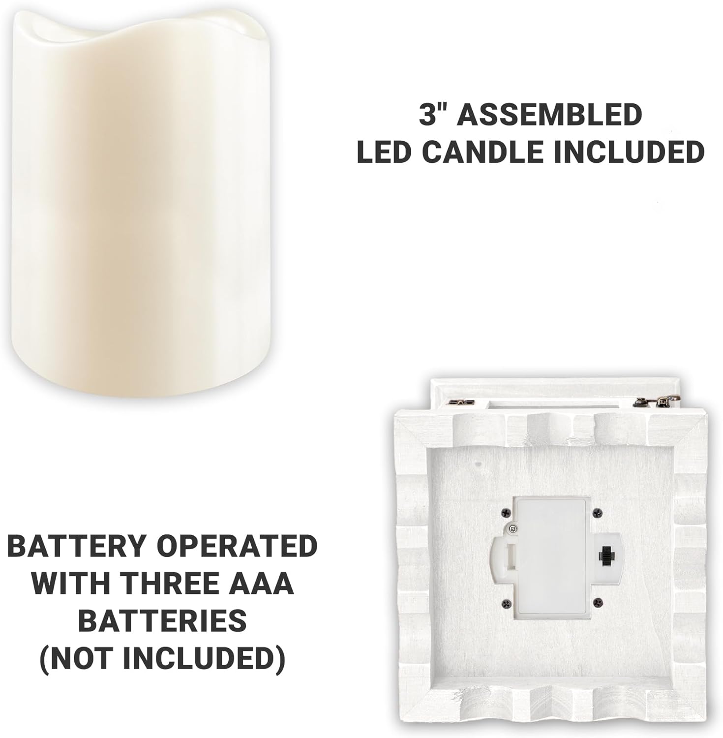 - PREMIUM QUALITY: Made of wood and stainless steel with a copper finish. Measures 13.5"Hx6.25"Sq. Flameless LED candle has automatic timer—6 hours on/18 hours off—requiring 3 AAA batteries (not included). Imported for final manufacture locally.