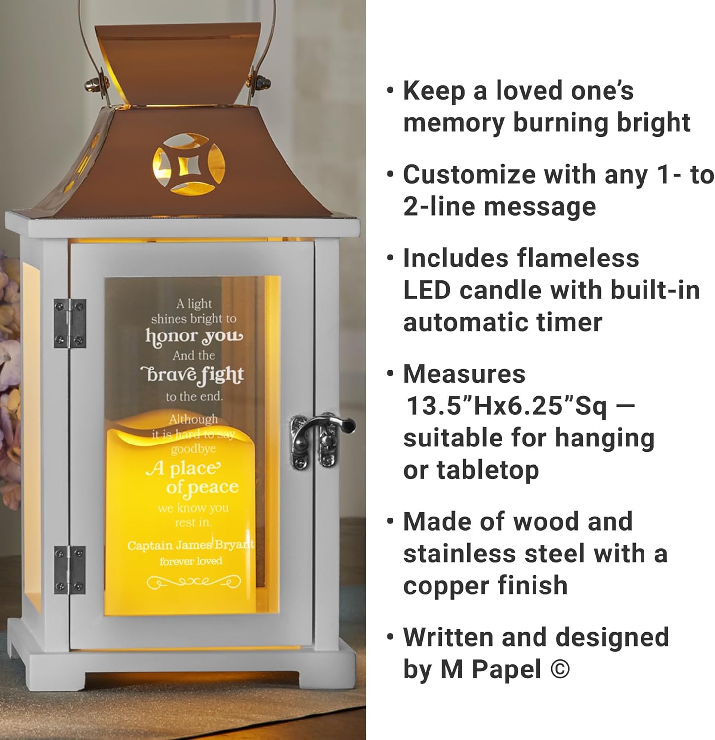 - UNIQUELY PERSONALIZED: Light the way forward! Customize this lantern with any 1- to 2-line engraved message up to 25 characters each. Written and designed by M Papel .