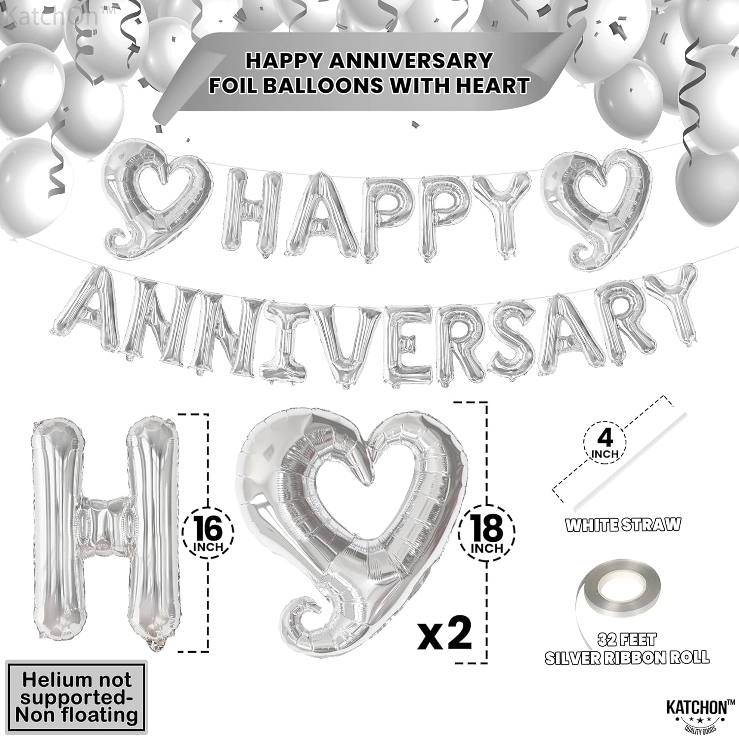 - SELF SEALING - 18 INCH | EASY TO INFLATE – This giant silver happy anniversary balloon pack that comes with a Happy anniversary silver balloon banner, 18 pieces. Designed with big 16 inch” foil letters, 18 Inch silver heart balloons, this silver happy anniversary sign silver lets celebrate special moments with children, friends, and family. Happy wedding balloons are self sealing, holding air for long time. Add sparkle to Silver anniversary celebration with our Happy anniversary ballons.