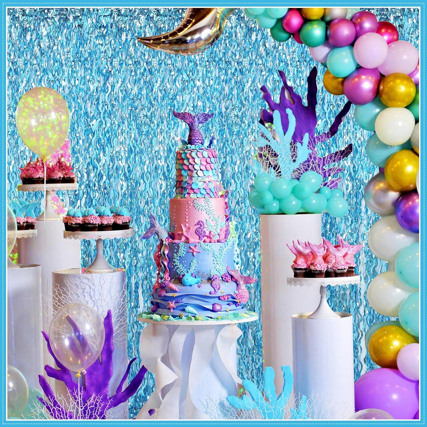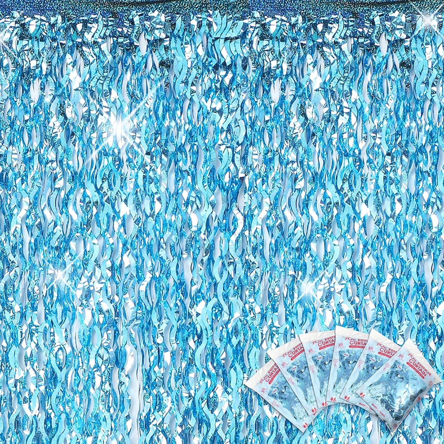 Jutom 6 Pieces 3.3 x 6.6 ft Wavy Tinsel Foil Fringe Curtains Foil Fringe Streamer Backdrop Party Curtain for Sea Mermaid Baby Shower Birthday Party Decoration(Light Blue)