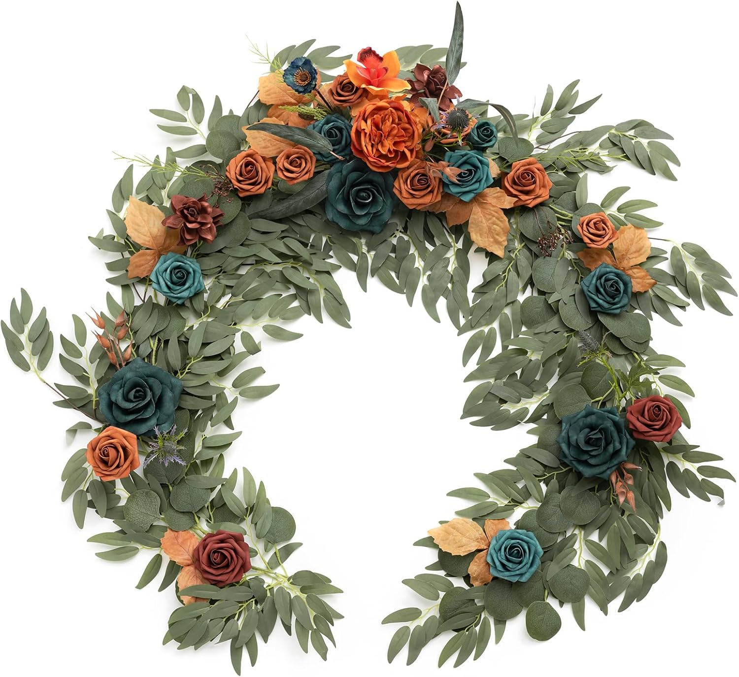 Ling's Moment Flower Garland - 6FT Eucalyptus & Rose - Sweetheart Table Decor for Wedding Reception, Artificial Floral Garland for Mantle, Christmas Decoration, Dark Teal & Burnt Orange
