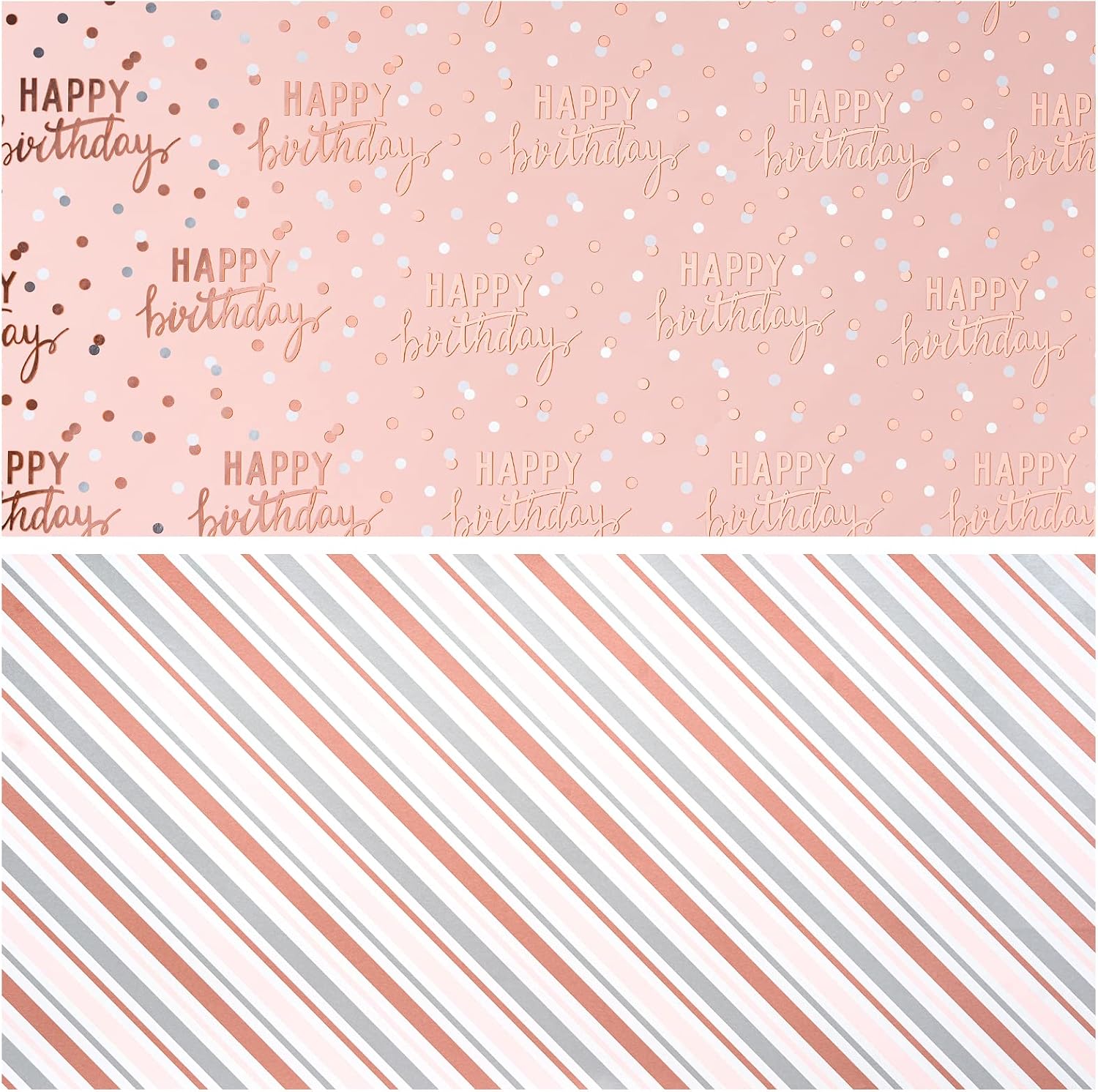 - HAPPY BIRTHDAY WRAPPING PAPER - This pink birthday wrapping paper features a charming dual-sided design. One side has a peach background with "Happy Birthday" text and scattered polka dots in elegant metallic rose gold foil. The reverse side presents a striped pattern in soft, coordinating tones, perfect for a modern and polished look.