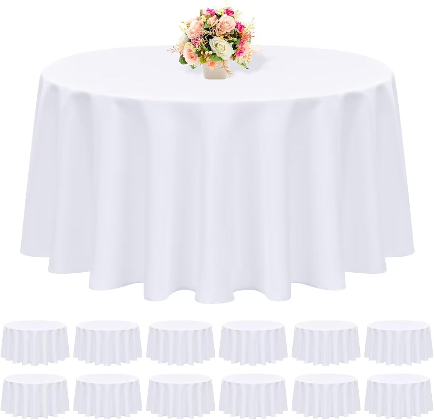- 【 Package Include】You will receive 12 packs of 90 inch white round polyester tablecloths, this 90 inch white round tablecloth is Ideal for standard 6FT(72") round tables, providing a 9" drop, or 15" if your round table is 5FT (60"). The product comes individually packaged in a re-sealable storage bag. White tablecover is more luxurious, classic and gracious, ideal for both formal & casual settings and makes a great gift for all occasions.