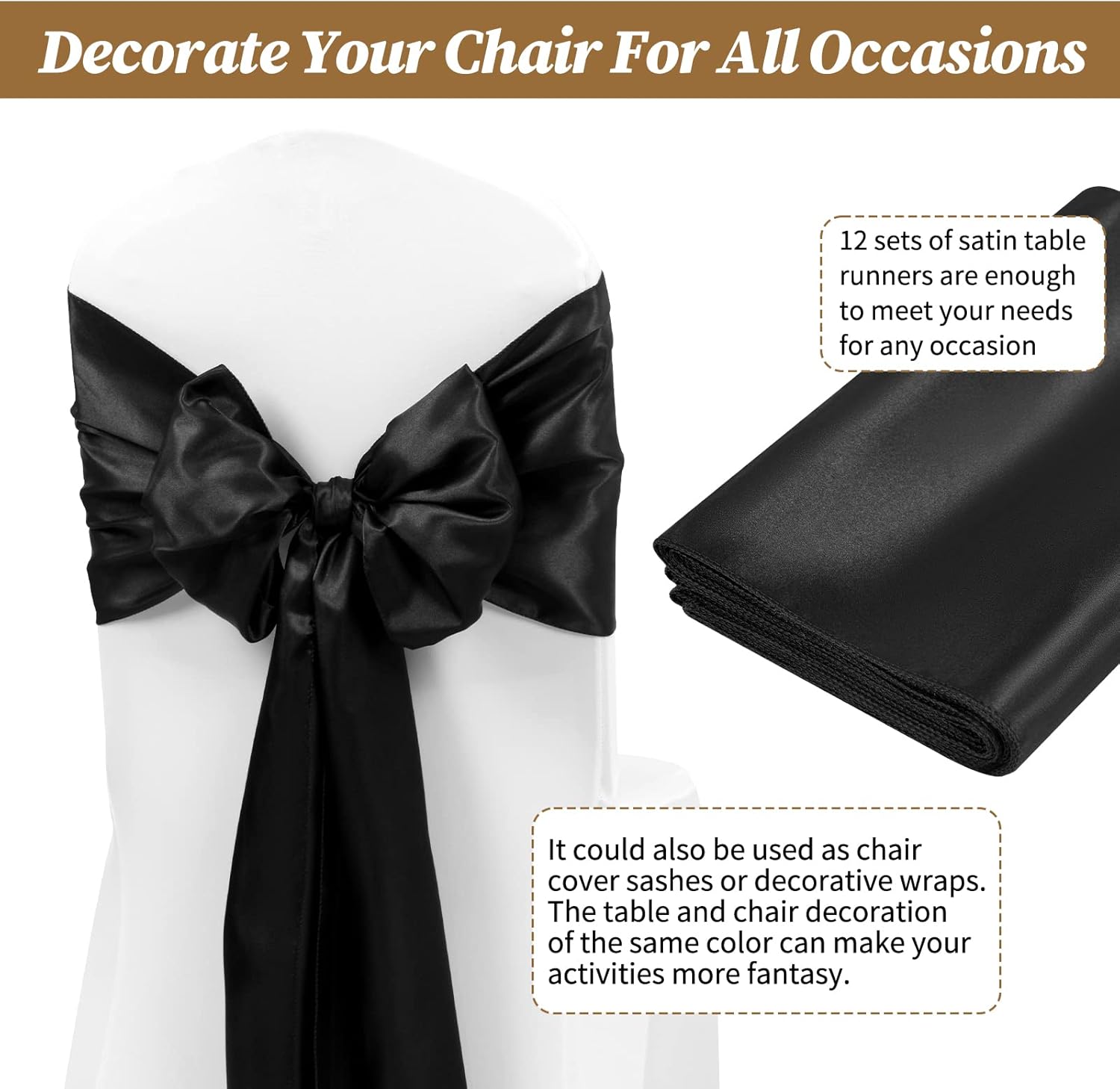 - đ„ăBlack Satin Table Runner Setă12 Pack black satin table runner measures 12" x 108" in size, appropriate for a table that can seat 8-10 people. This satin table runner can fit a 6ft/8ft rectangular table or round table well.This satin table runner is great for event table decorations.Our satin table runner make your dining table more dazzling and outstanding.Purchase our 12piece satin table runner and save even more.