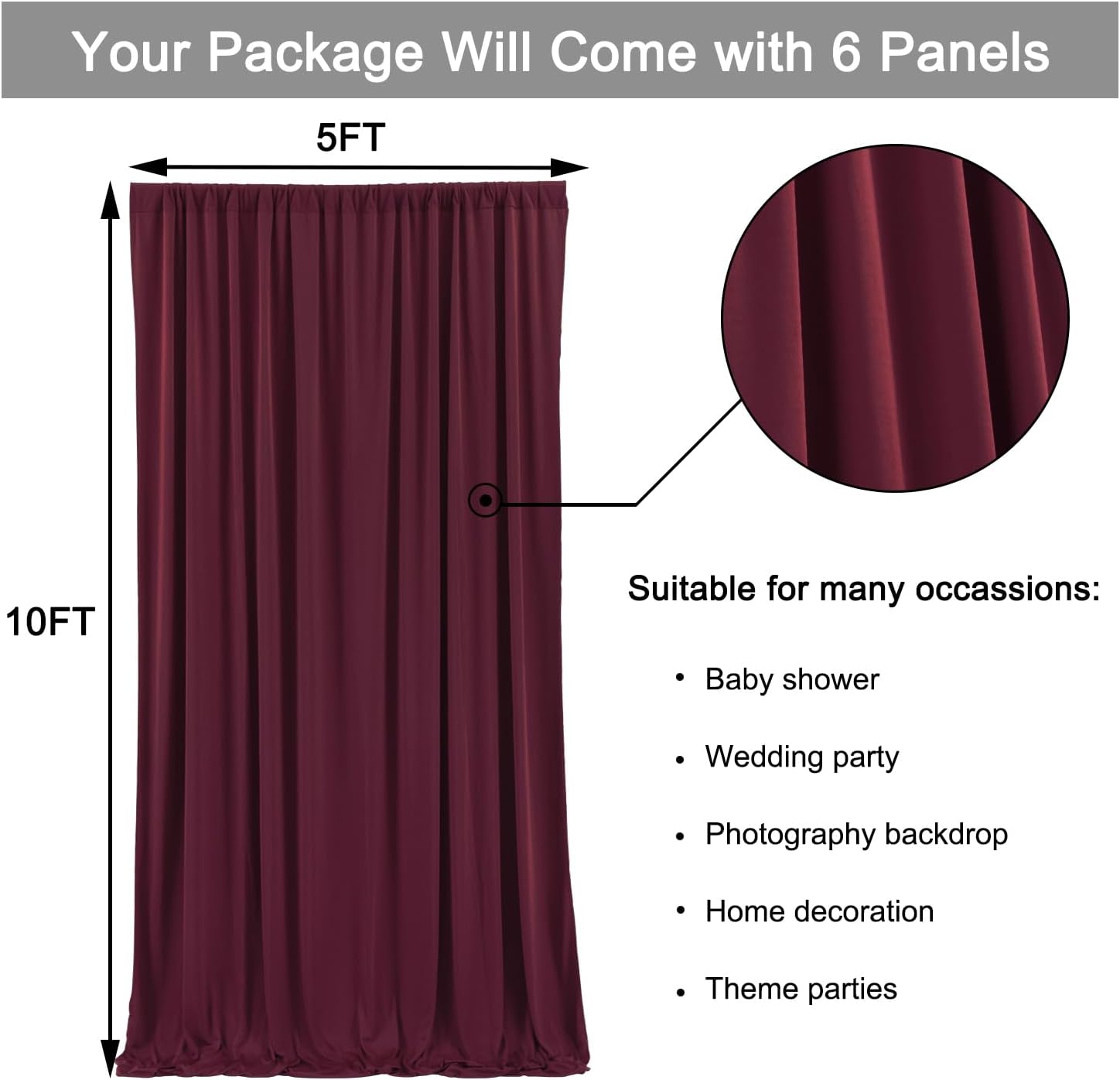 - Photography Backdrop Curtain Panels: Your package will come with 6 panels maroon photography backdrop drapes. Each background panels measures 5ft width and 10ft height.Entire backdrop curtain measures 30ft x 10ft.