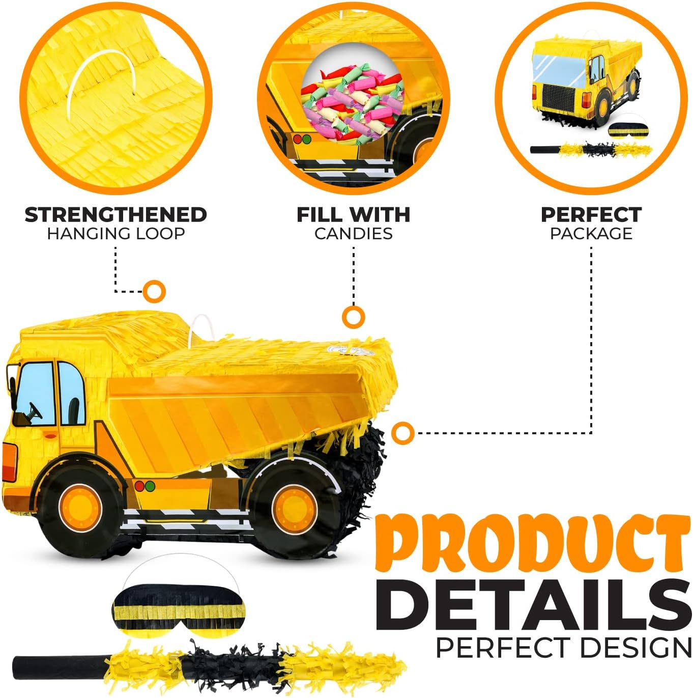 Small Dump Truck Pinata Bundle with a Blindfold and Bat(16 x 9 x 6.5 Inches), Kids Excavator Pinata for Construction Birthday Parties, Boys Birthday Party Supplies