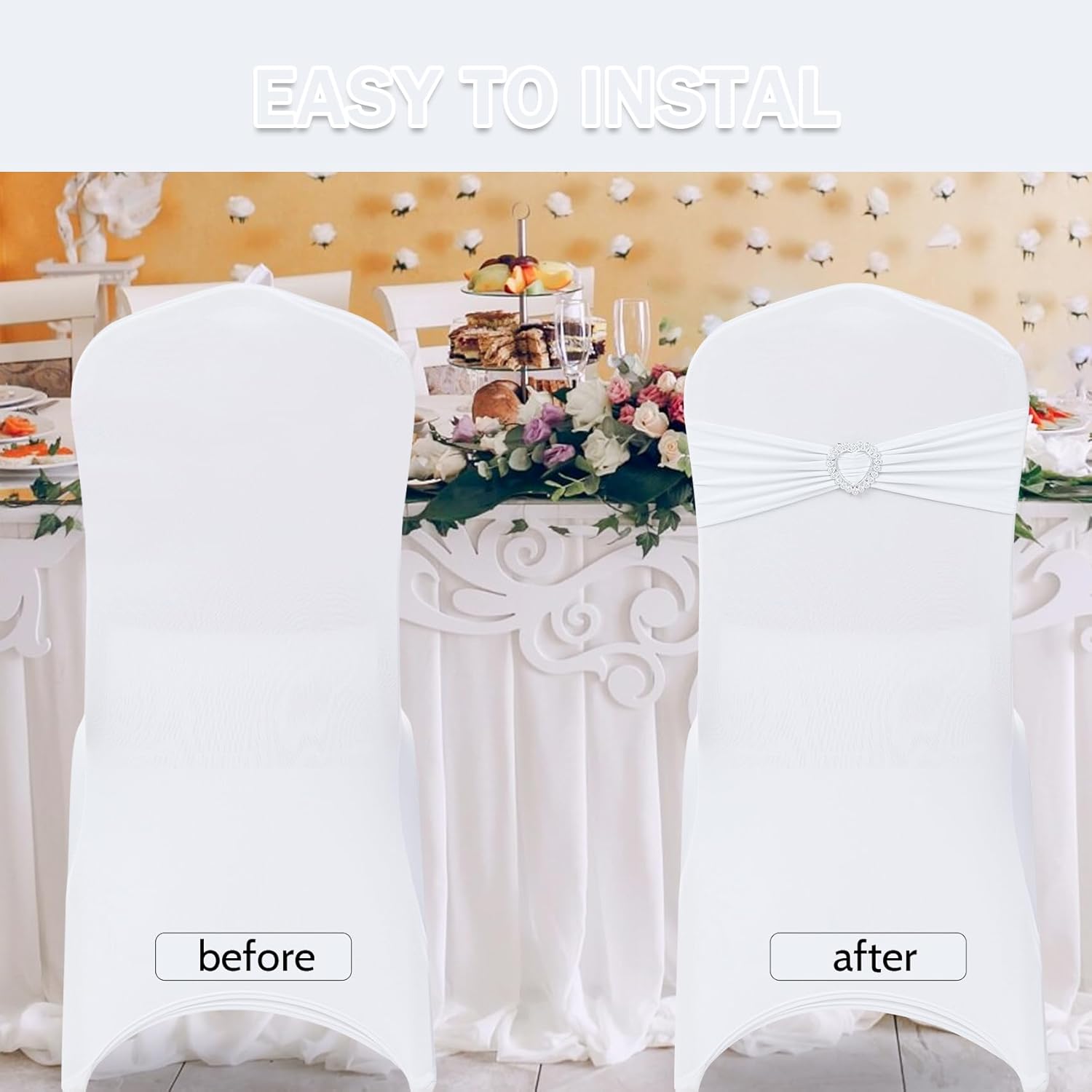 - MATERIAL:Sash(90% Polyester & 10% Spandex ), Buckle(100% Plastic).These white chair covers are not included.