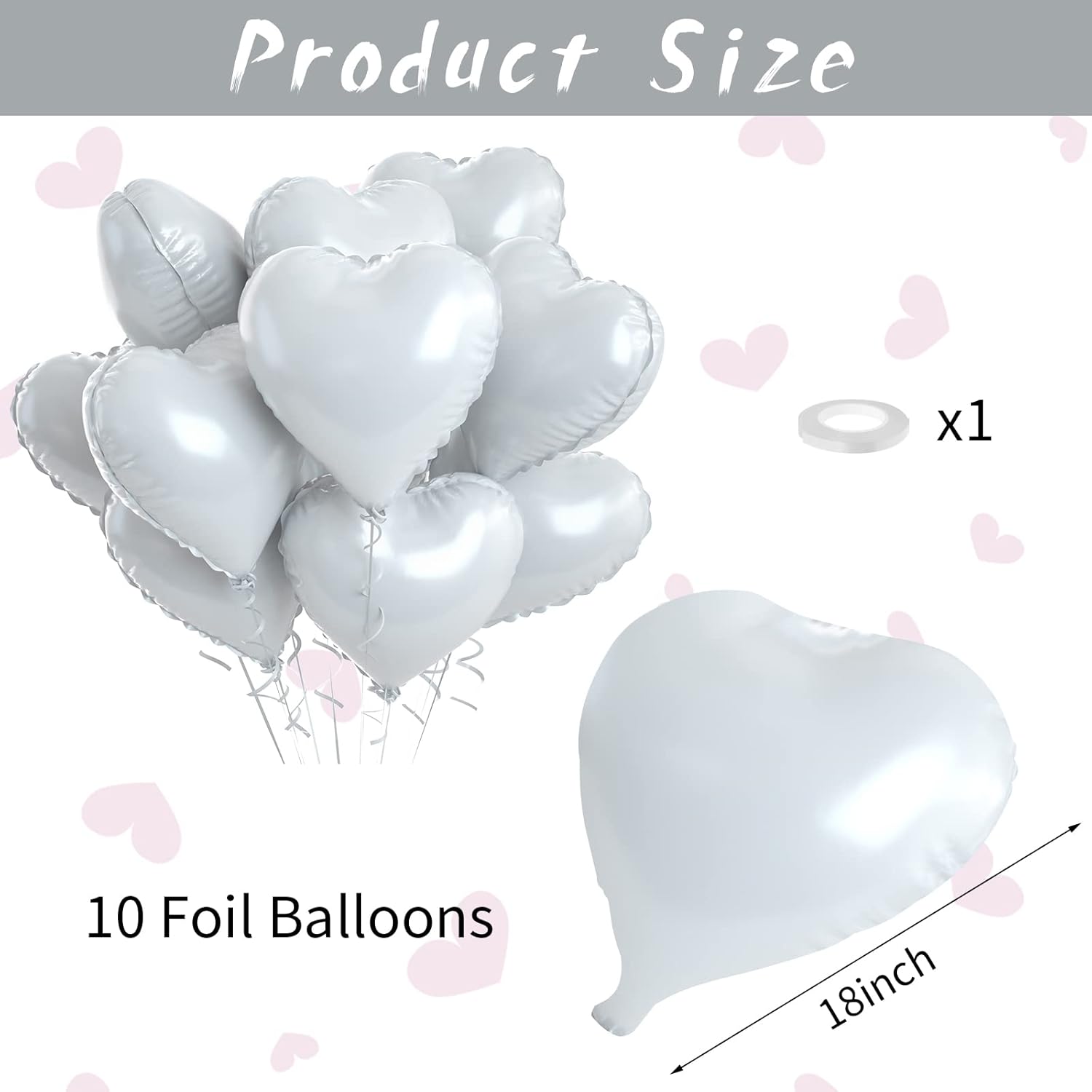 - ๐ 10 PCS White Heart Balloons: Our package contains 10 x 18 inches white heart shaped balloons, 1 x 10m ribbon. The white foil heart balloons are specially designed to add a touch of fun and surprise to any party or holiday celebration. With a size of 18 inches, they are the perfect addition to your decorating needs, leaving your guests with an unforgettable smile!