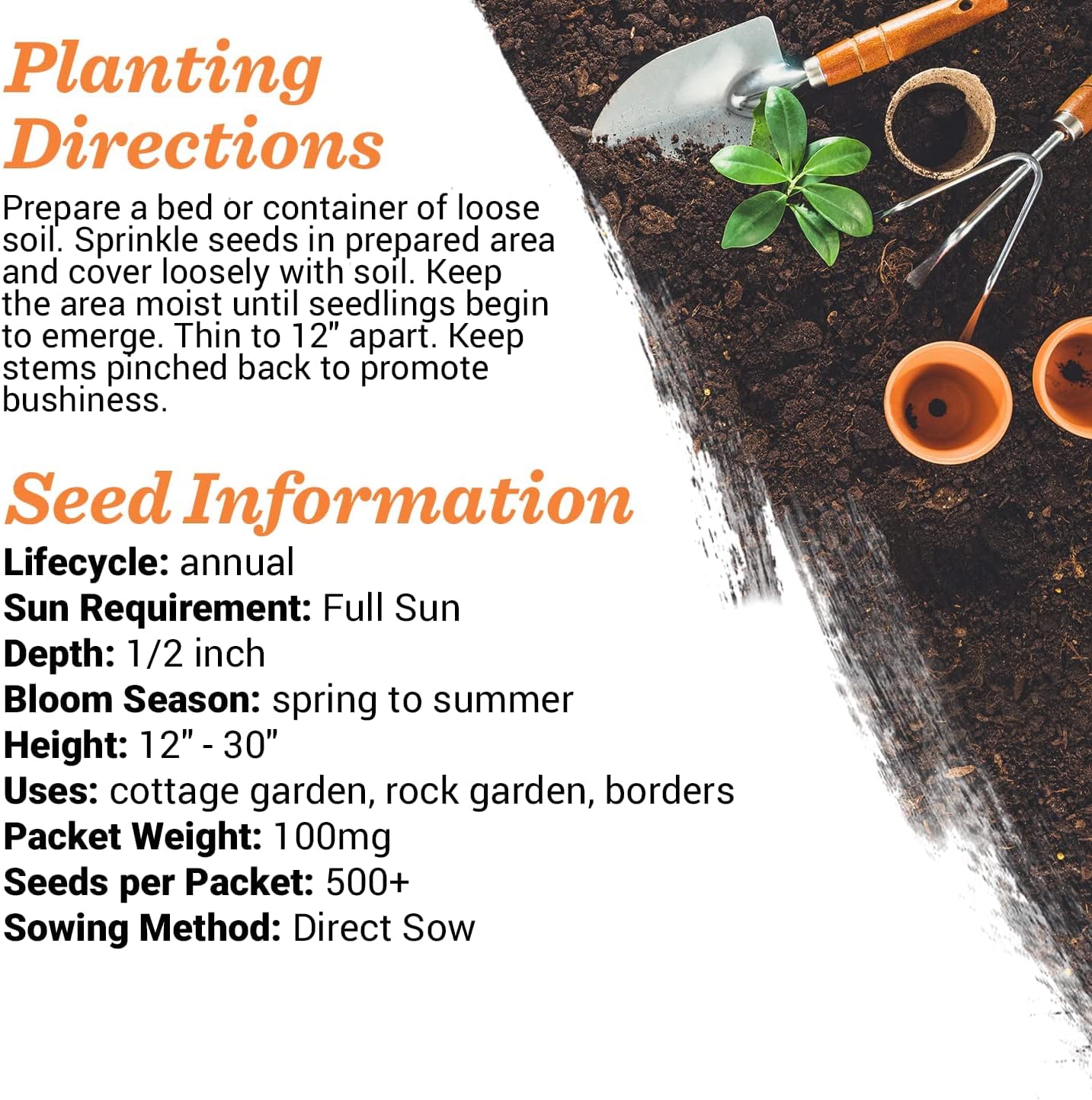 - PLANTING DIRECTIONS: Prepare a bed or container of loose soil. Sprinkle seeds in prepared area and cover loosely with soil. Keep the area moist until seedlings begin to emerge. Thin to 4"-6" apart. Keep stems pinched back to promote bushiness.