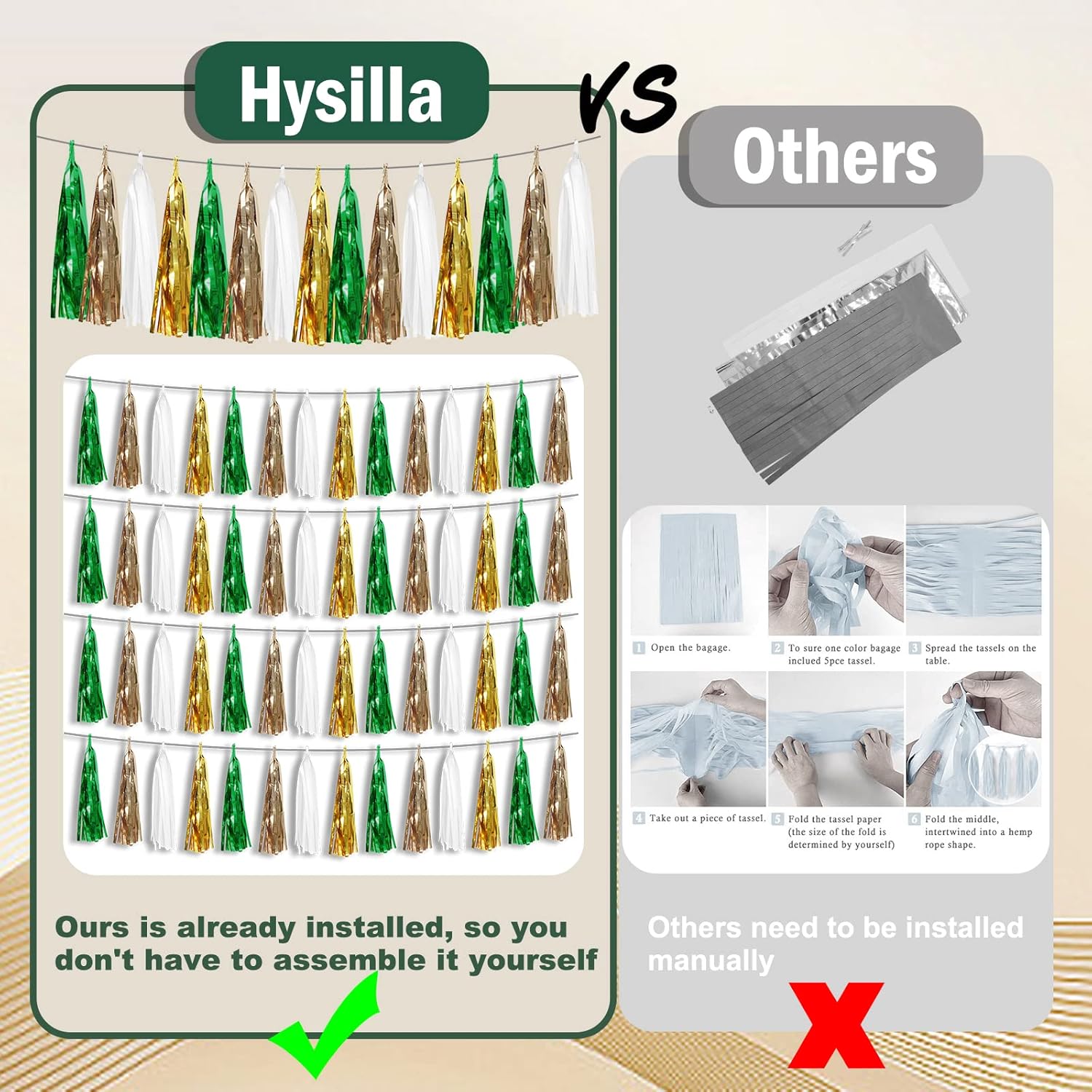 - 【Reusable Tassel Garland Material】: high-quality metallic foil tassel garlands, with the virtue of nice craftsmanship and lightweight, they are reusable and safe, and not easy to fade; They come with white ribbon for hanging, and garland tassels hang perpendicular to the string, and are adjustable to provide you with the option of spreading the tassels out or piecing them closer together.