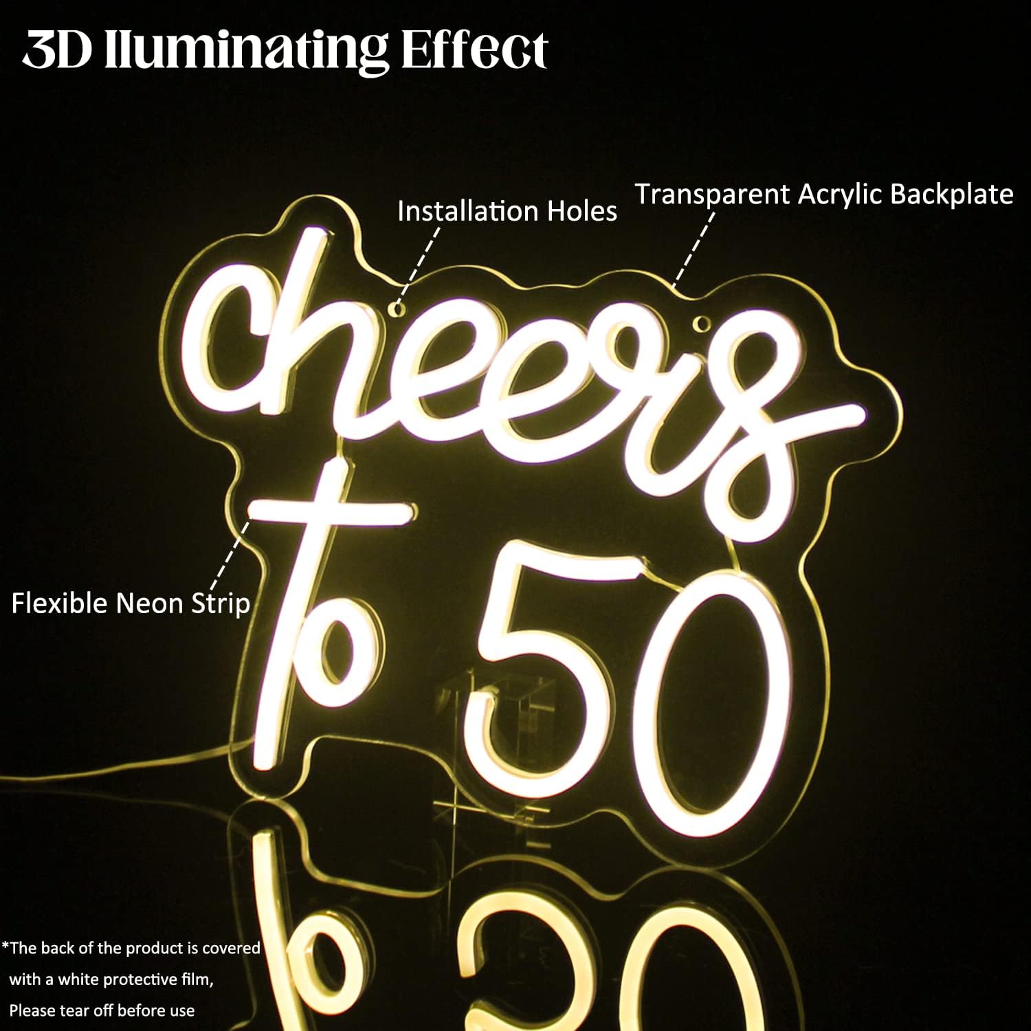 - Happy 50th Decor: Cheers to 50 years neon light up sign is perfect to make a great addition to the 50th anniversary theme or to happy 50th birthday decorations. It is also suitable as a gift for your lover or friend.