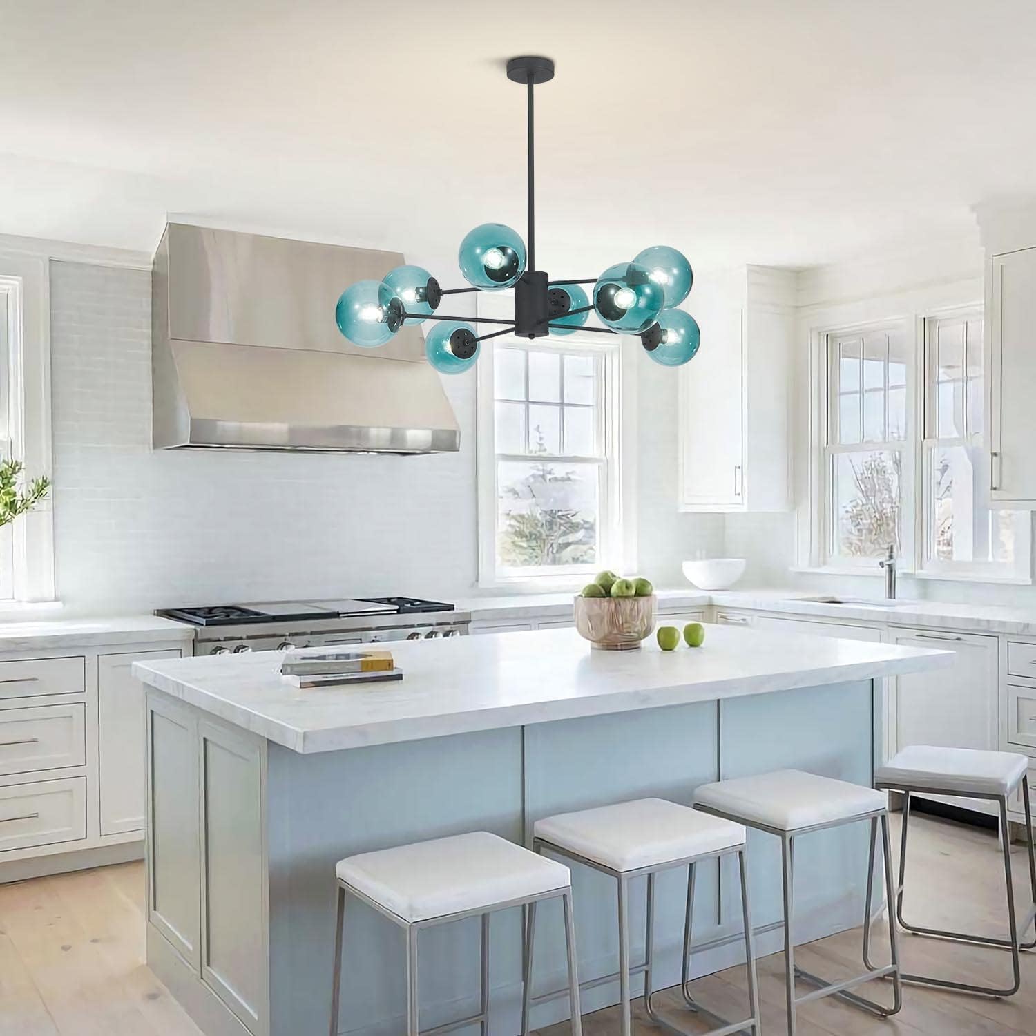 - 【Blue Glass Chandelier Dimension】Diameters: 36.6''(93cm), Canopy: 4.7''(12cm), Globe: 5.9”(15cm), 2 extension rods (7.9”+11.8”, Maximum: 19.7", Minimum: 7.9"). Light Source: E26 base, Irradiated area: 10-25㎡, Voltage: 110-240V. (Note: If glass globe broken, cracked, shattered, please contact us, we could send you replacement free)