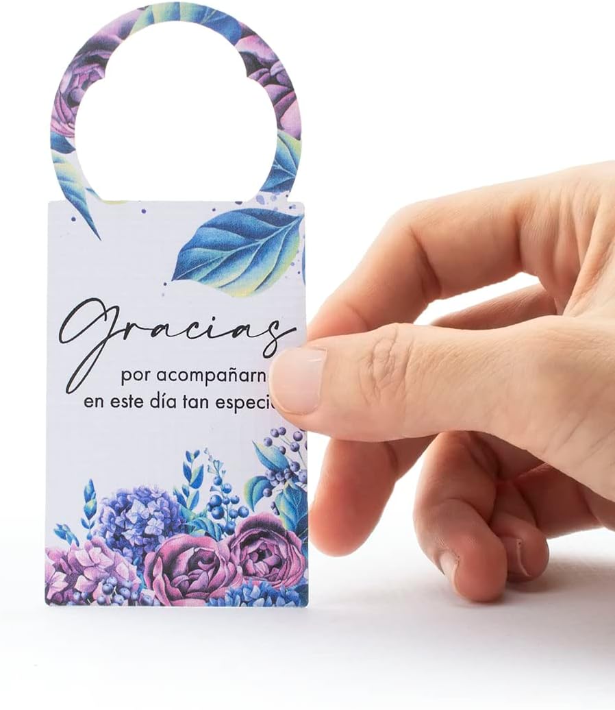 - The tags are made using 250GSM (170lbs) premium quality white card stock with linen texture. Each tag is printed with the wordings "Gracias por acompañarnos en este día tan especial".
