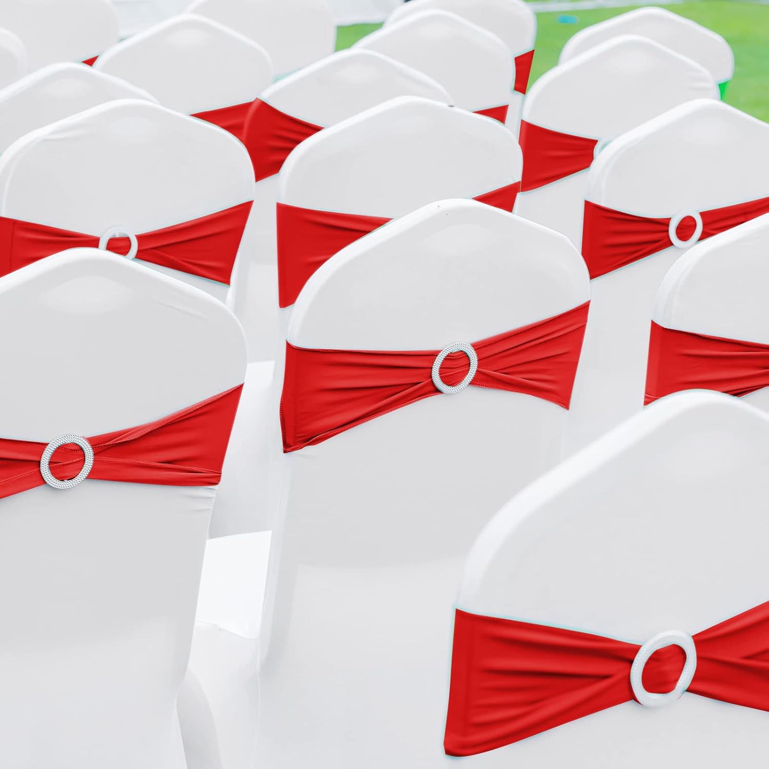 CHENGU 150 Pieces Spandex Stretch Chair Sashes Bows Elastic Chair Cover Bands Ties with Buckle Slider for Wedding Party Reception Events Universal Ceremony Banquet Decorations (Red)