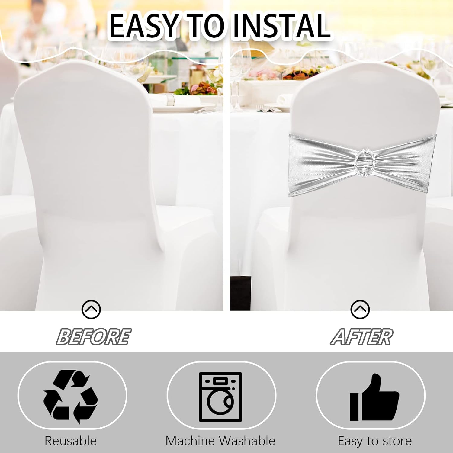 - Enough Quantity: 150 pieces chair sashes with buckle slider can meet your needs of various parties and activities; Each chair bands measures about 6 x 15 inches/ 15 x 36 cm, which is suitable for a chair of 13 to 20 inches, adding elegance to your banquet and a touch of sophistication to any formal occasions
