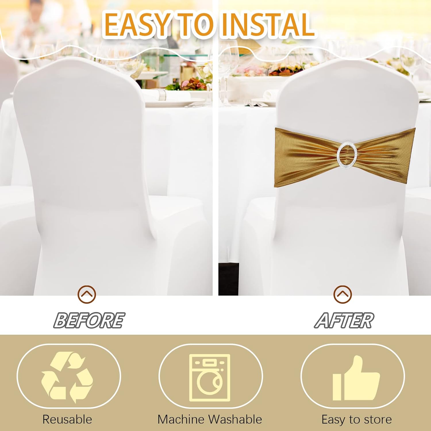 CHENGU 150 Pieces Spandex Stretch Chair Sashes Bows Elastic Chair Cover Bands Ties with Buckle Slider for Wedding Party Reception Events Universal Ceremony Banquet Decorations (Glossy Gold)