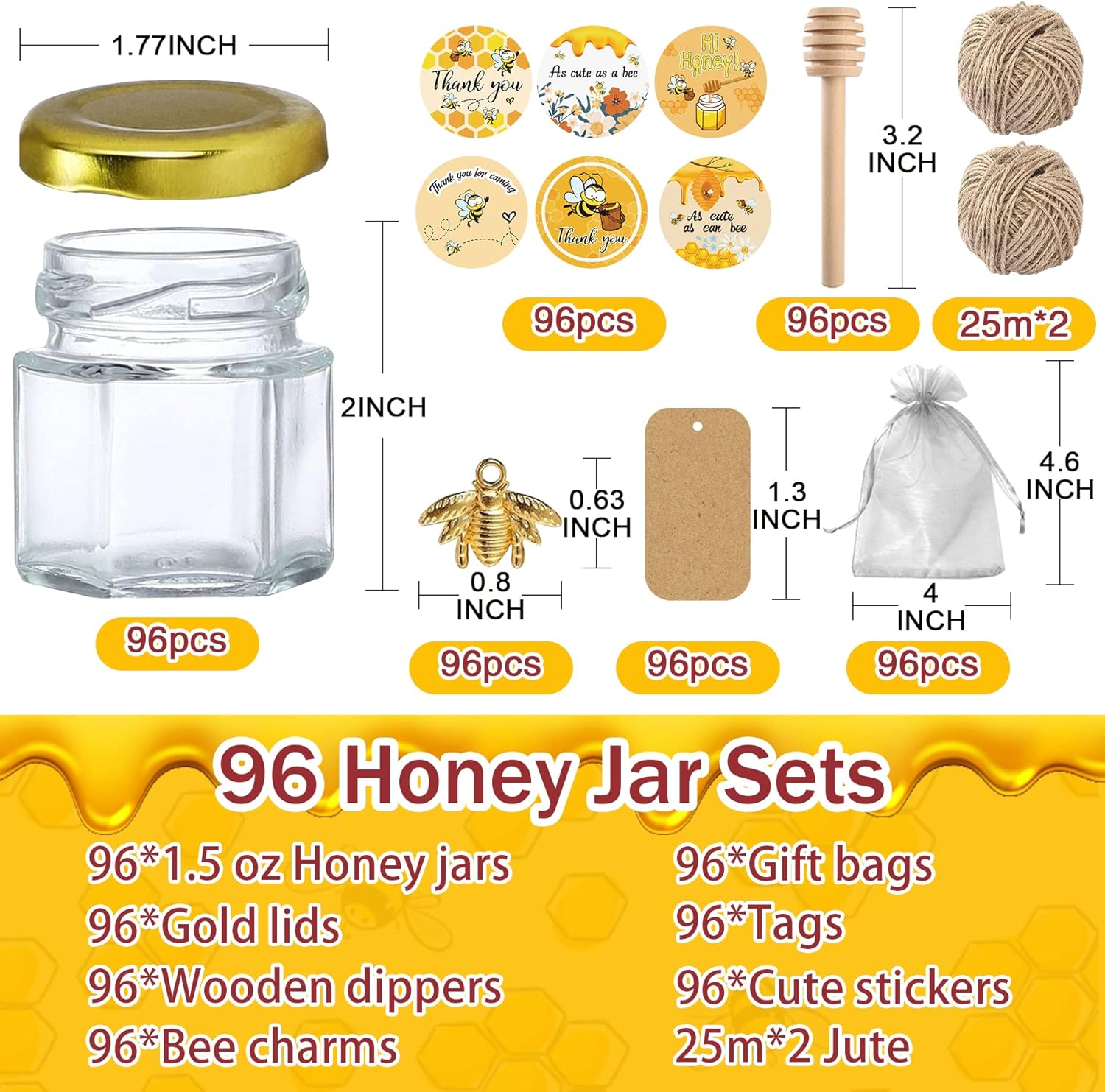 - Great Value Mini Honey Jars Set: This set includes 96 hexagon mini honey jars with dippers, lids, stickers, bee charms, gift bags, tags, and 50m of jute twine. Everything you need to craft thoughtful party favors or sweet handmade gifts with ease.