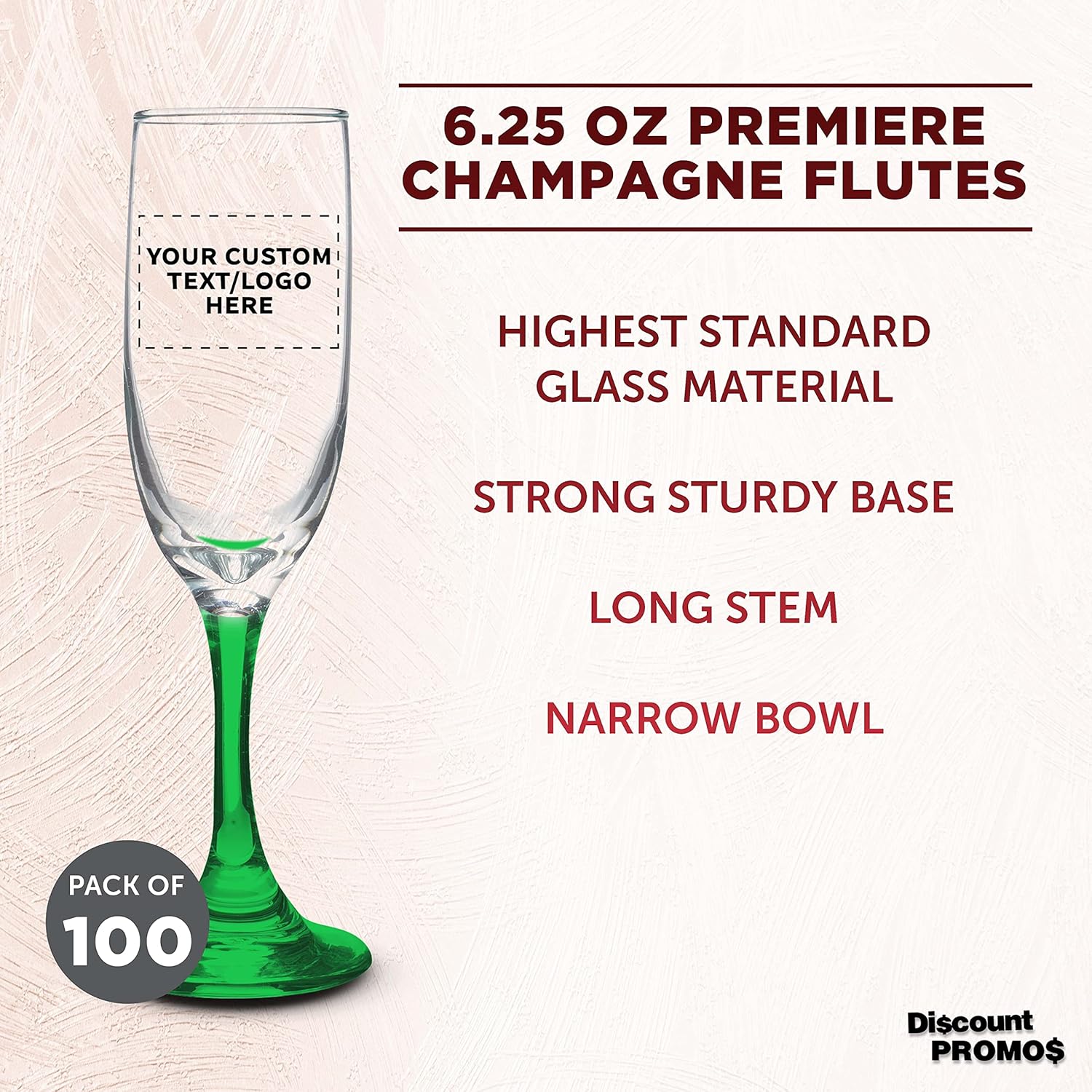 DISCOUNT PROMOS Custom Premiere Champagne Flutes 6.25 oz. Set of 100, Personalized Bulk Pack - Elegant Drinkware for Weddings, Events, & Promotional Gifts - Green