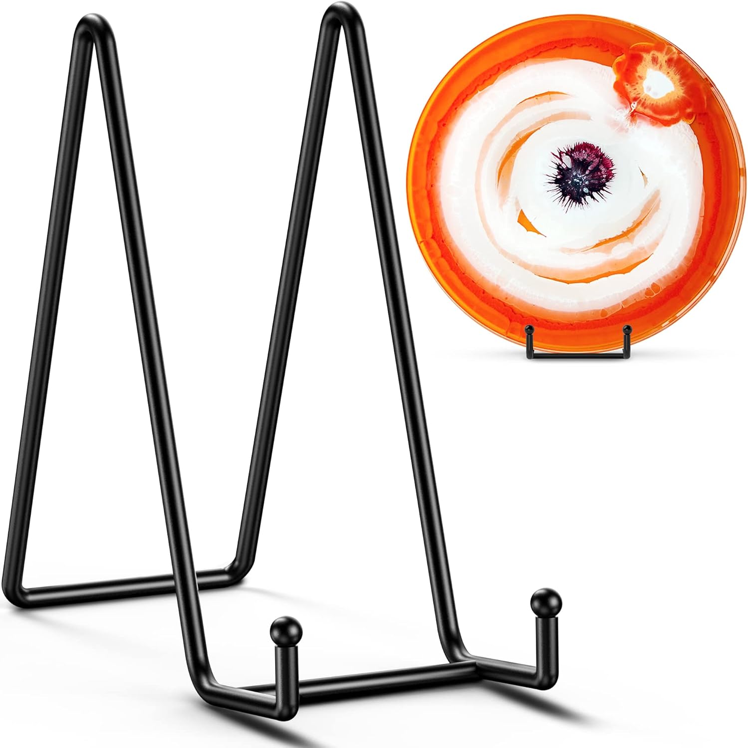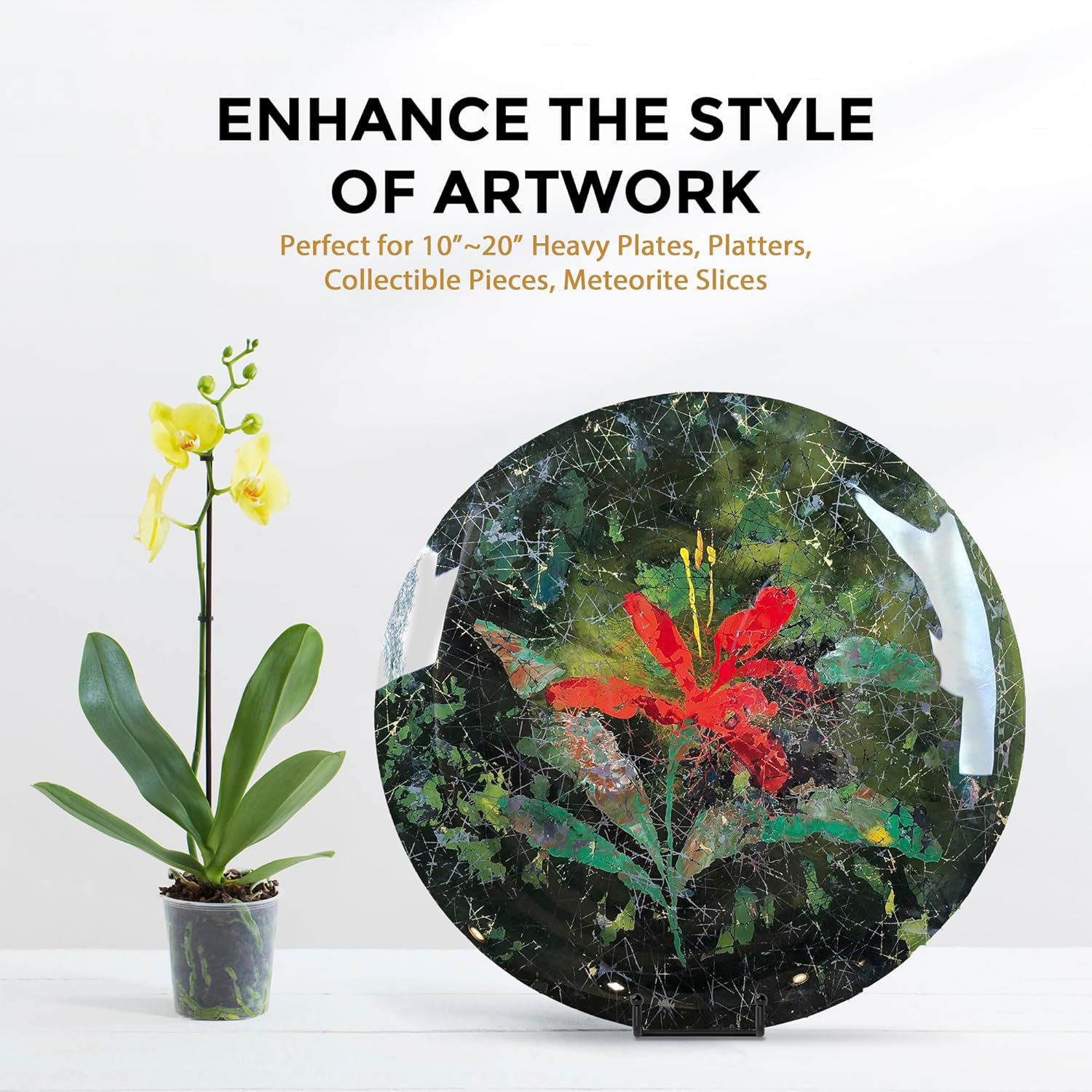 - STURDY DESIGN: - Made with wrought iron construction and a matte black powder-coated finish, this plate display stands features a reliable 8" depth and 4" widened base design, capable of securely displaying a variety of large items such as decorative plates, platters, plaques, photo frames, trays, tiles, cutting boards, cookbook, sign, canvas art, and more.