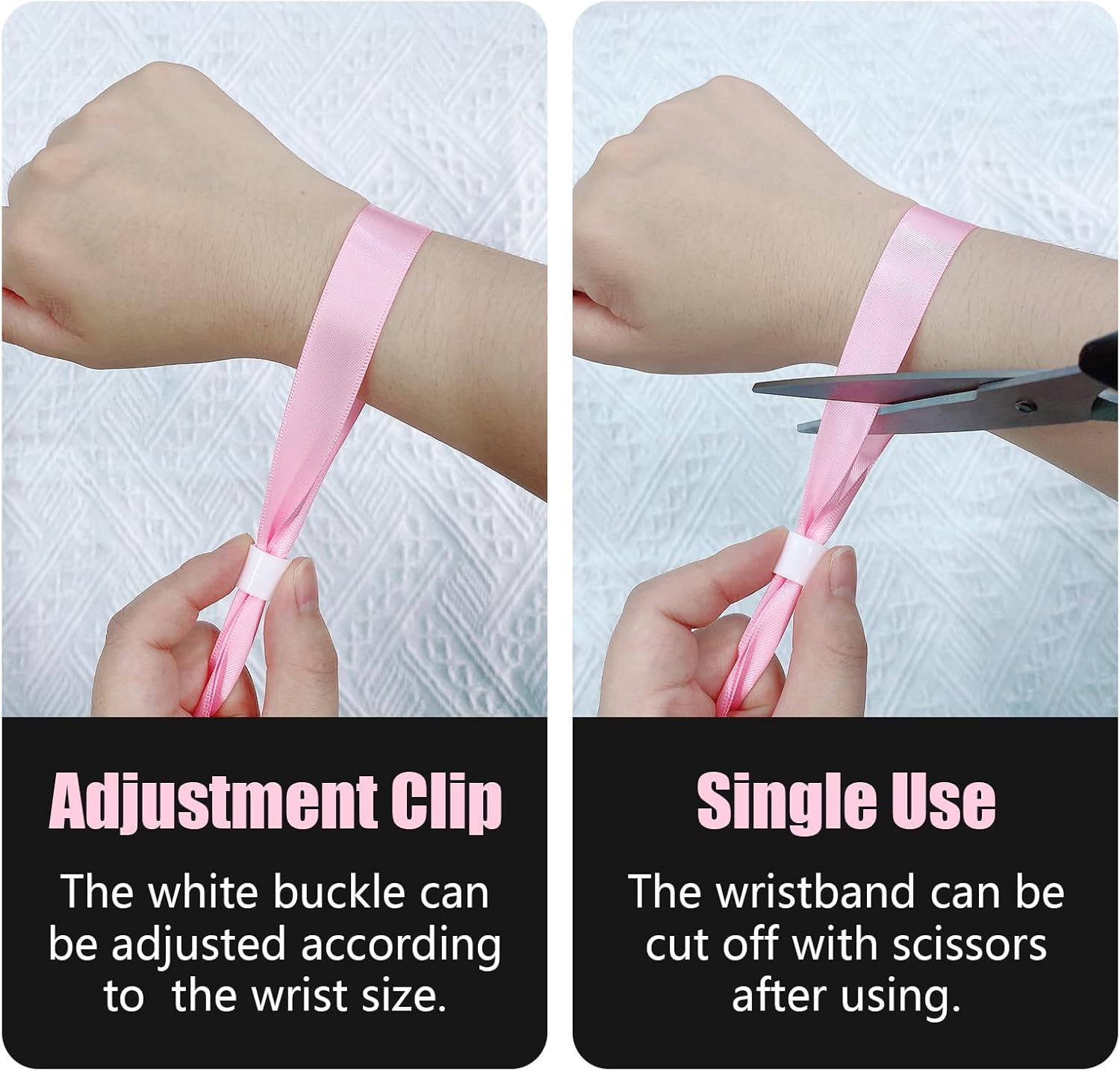 - Event wristbands party: Our wristbands are comfortable and stretch resistant. We offer wristbands in sufficient quantity and multiple colors. Disposable ribbon wristbands that can be adjusted to fit your wrist size. They are soft and comfortable to wear and have a beautiful surface to meet your needs for use and sharing in various occasions.