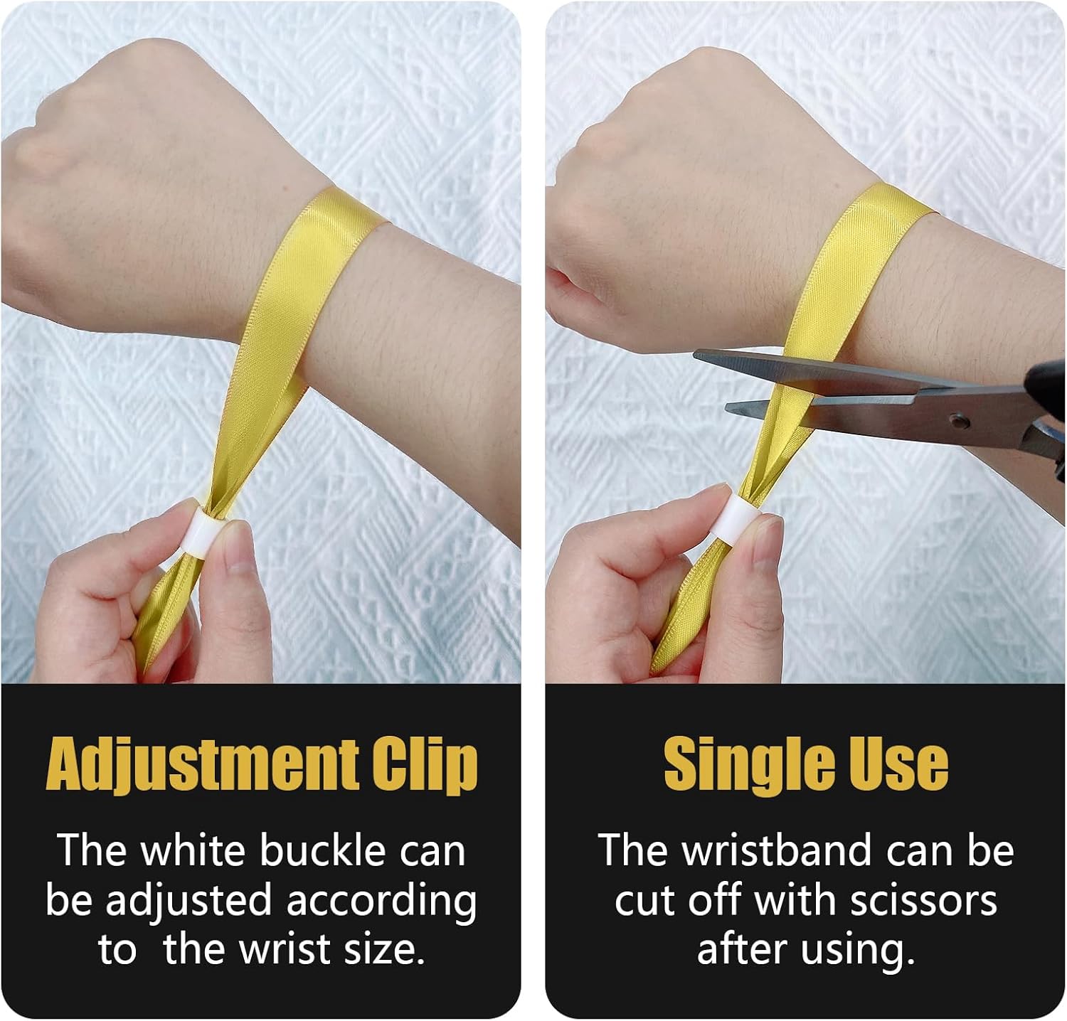 - Event wristbands party: Our wristbands are comfortable and stretch resistant. We offer wristbands in sufficient quantity and multiple colors. Disposable ribbon wristbands that can be adjusted to fit your wrist size. They are soft and comfortable to wear and have a beautiful surface to meet your needs for use and sharing in various occasions.