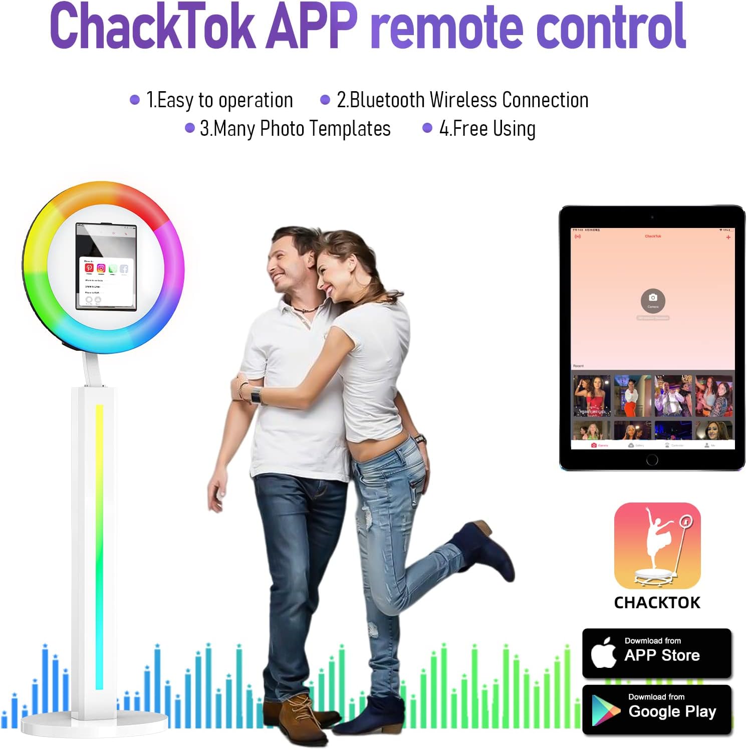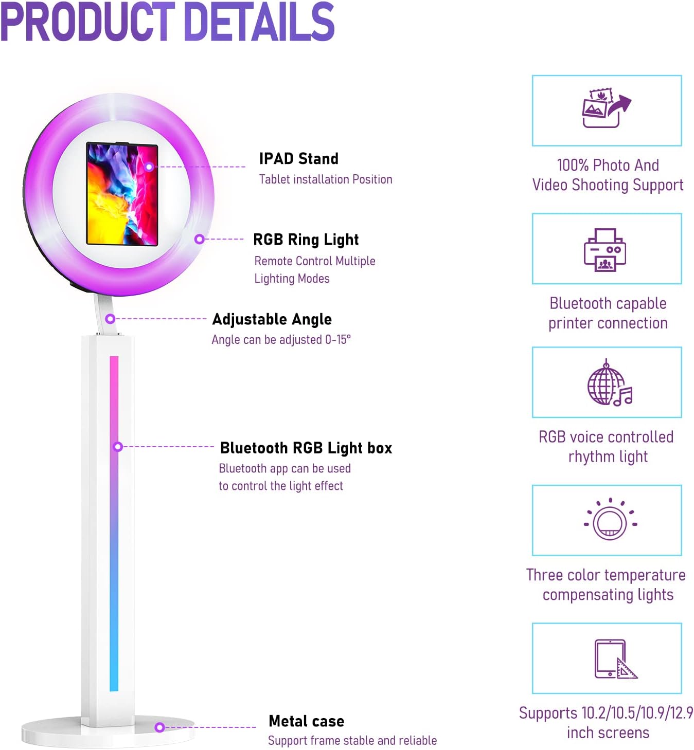 - 【Photo Booth RGB with Ring Light】This Portable Photo Booth is equipped with RGB ring light, 20+ color lighting modes, each lighting mode can choose 1%-100% brightness. you can adjust the color temperature (2700K-6500K) and brightness (0%-100%) by the remote control. And the angle of the ring light is flexible and adjustable.