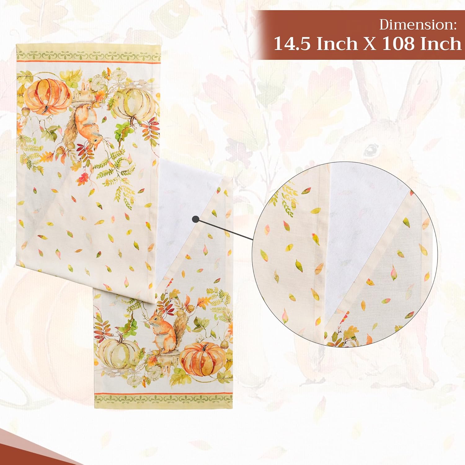 - Package includes: 1 table runner measuring 14.5" x 108". Ideal for banquet tables, dining tables, or adding a spring, Thanksgiving, Christmas theme to your party décor. Our table runners 108 inches long offers a unique charm for both casual and festive settings.