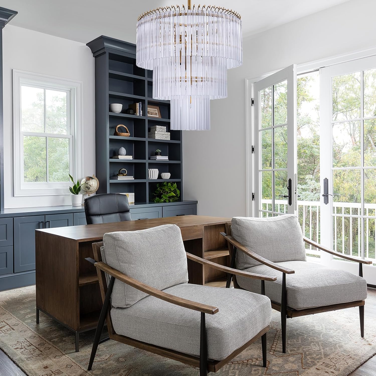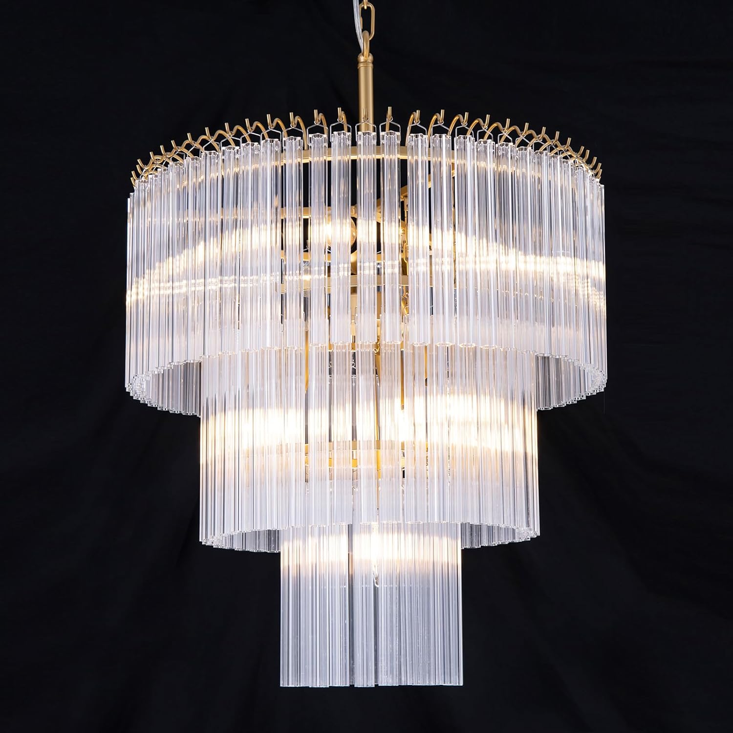 - Glass Tiered Chandelier: This chandelier is decorative with a classic line. The hand-textured glass cylinder cascade from the frame to radiate and refract light. The glass is intricately molded and shaped to form ornate cylinders that cascade in 3 tiers from the central frame