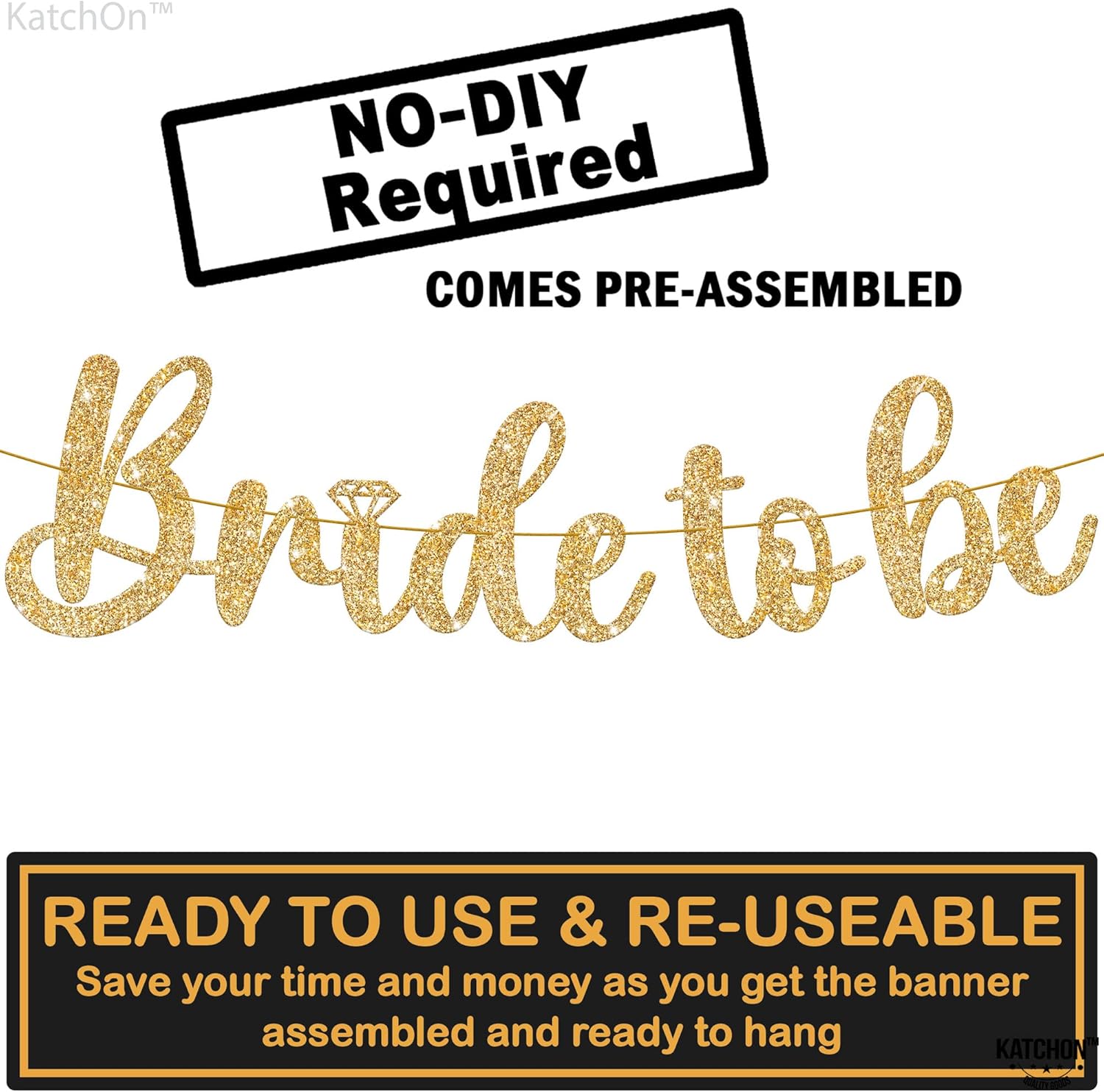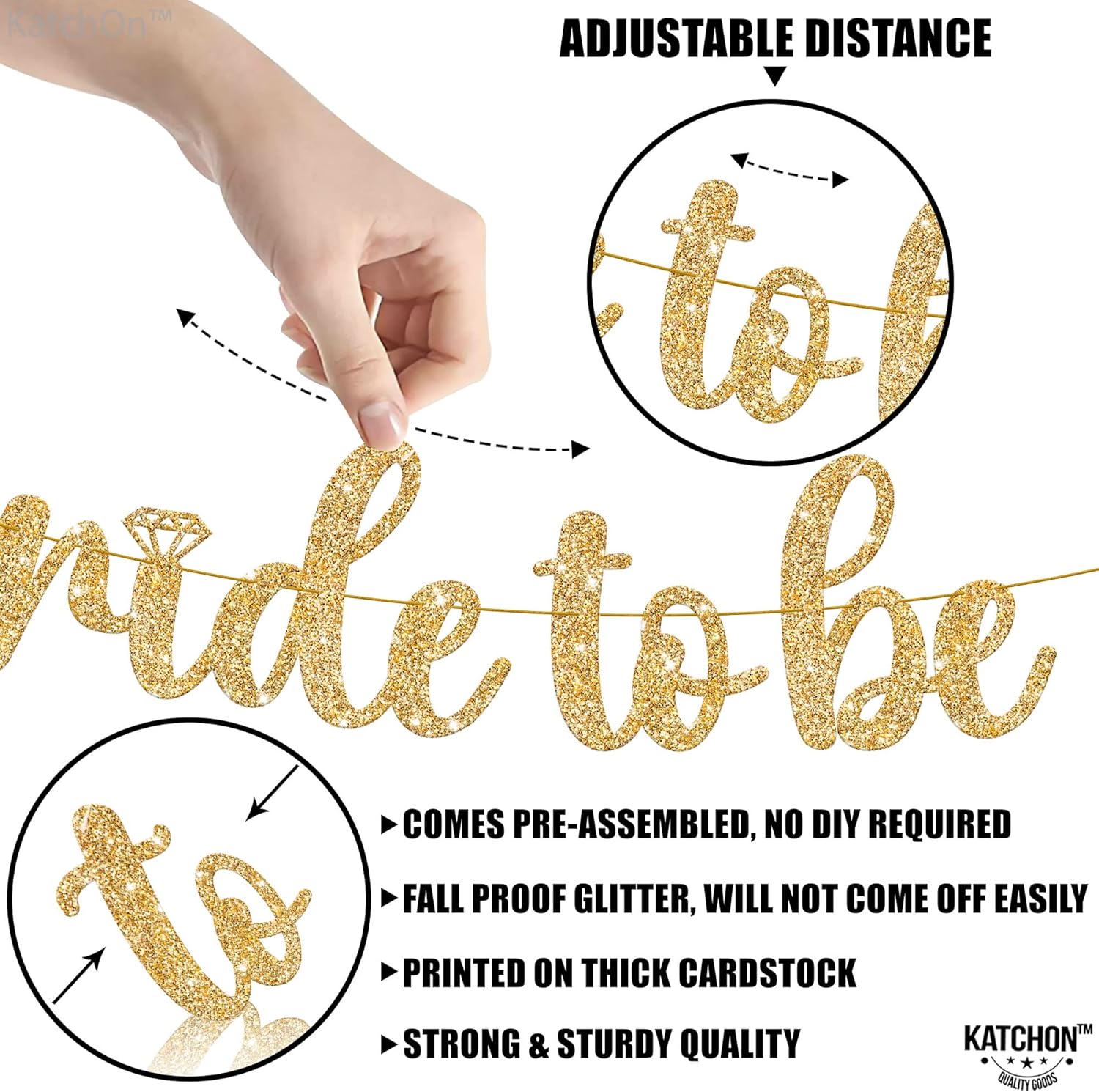 - PRE-STRUNG | NO DIY : Our gold bride to be banner comes pre-strung on a 10 Feet strand, saving you from any DIY work. Our pre-strung bridal shower decor eliminates the need for constant adjustments. Unlike others, our banners are designed with smaller punch holes, ensuring that the letters stay securely in place along the 10 ft strand. Simply position the pre strung bride to be banner as desired, and the letters will stay in position, even when angled! bride to be banner for bridal shower bride decorations