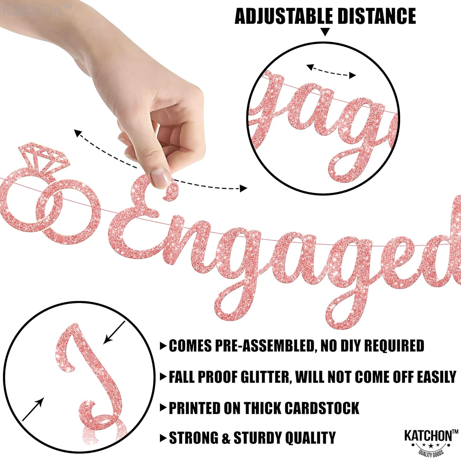 - PRE-STRUNG | DID WE MENTION NO DIY ? : Our rose gold engaged banner comes pre-strung on a 10 Feet strand, saving you from any DIY work. Our pre-strung engagement party banners eliminate the need for constant adjustments. Unlike others, our banners are designed with smaller punch holes, ensuring that the letters stay securely in place along the 10 ft strand. Simply position the bride banner as desired, and the letters will stay in position, even when angled!