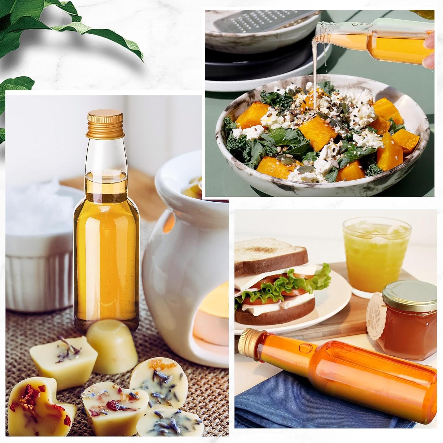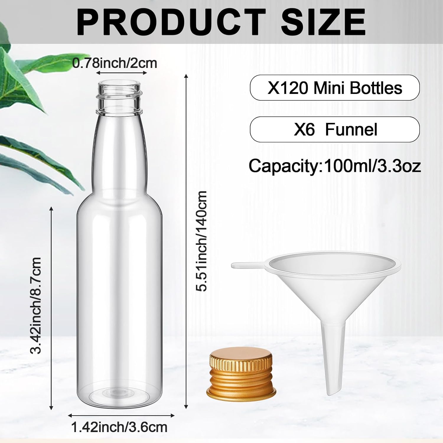 120 Pcs Mini Liquor Bottles Airtight Shot Miniature Empty Plastic Alcohol Spirit Shot Bottles with Funnels for Party Favors, Weddings(3.3 oz,Gold)